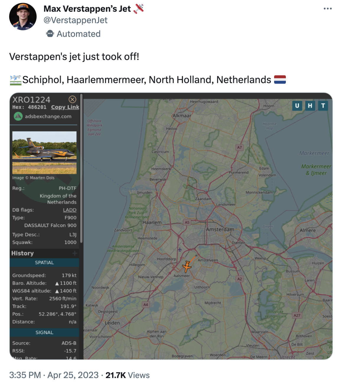 监视这些频繁飞行者甚至已经成为一种互联网消遣。航空播客The Mic High Club的联合主持人门诺·斯瓦特在看到一个推特账号跟踪特斯拉(和推特)首席执行官埃隆·马斯克的私人飞机引起关注后,开始追踪荷兰富有名人的私人飞机。斯瓦特最受欢迎的账号 @VerstappenJet分享了一架由一级方程式赛车手马克斯·维斯塔潘拥有的飞机的行踪,他有时从斯希普霍尔起飞。