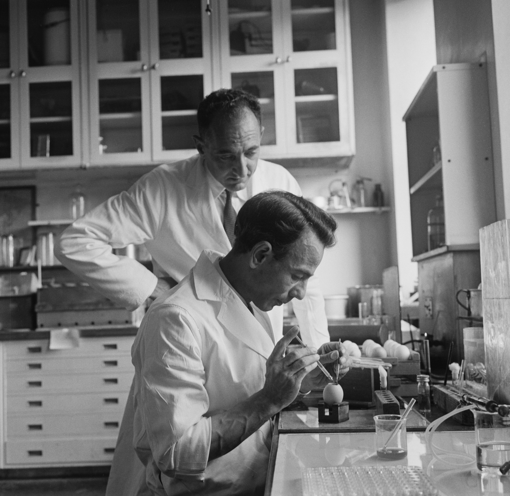 科学家们在1961年11月3日使用基于鸡蛋的技术准备流感疫苗。来源:晚间标准/赫尔顿档案馆/盖蒂图片社这些疫苗成为美国军方的秘密优势,直到几年后,科学家们遇到了一个不愉快的惊喜。当时的季节性爆发实际上是另一种毒株——流感B的杰作。疫苗被调整以包含两种毒株,并在1940年代首次向普通大众推出。