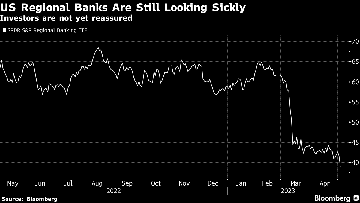 无论其他方面如何,第一共和银行的收购显然并没有解决问题。这里有一张KRE的图表,它是跟踪标普地区银行指数的交易所交易基金(ETF)的代码。