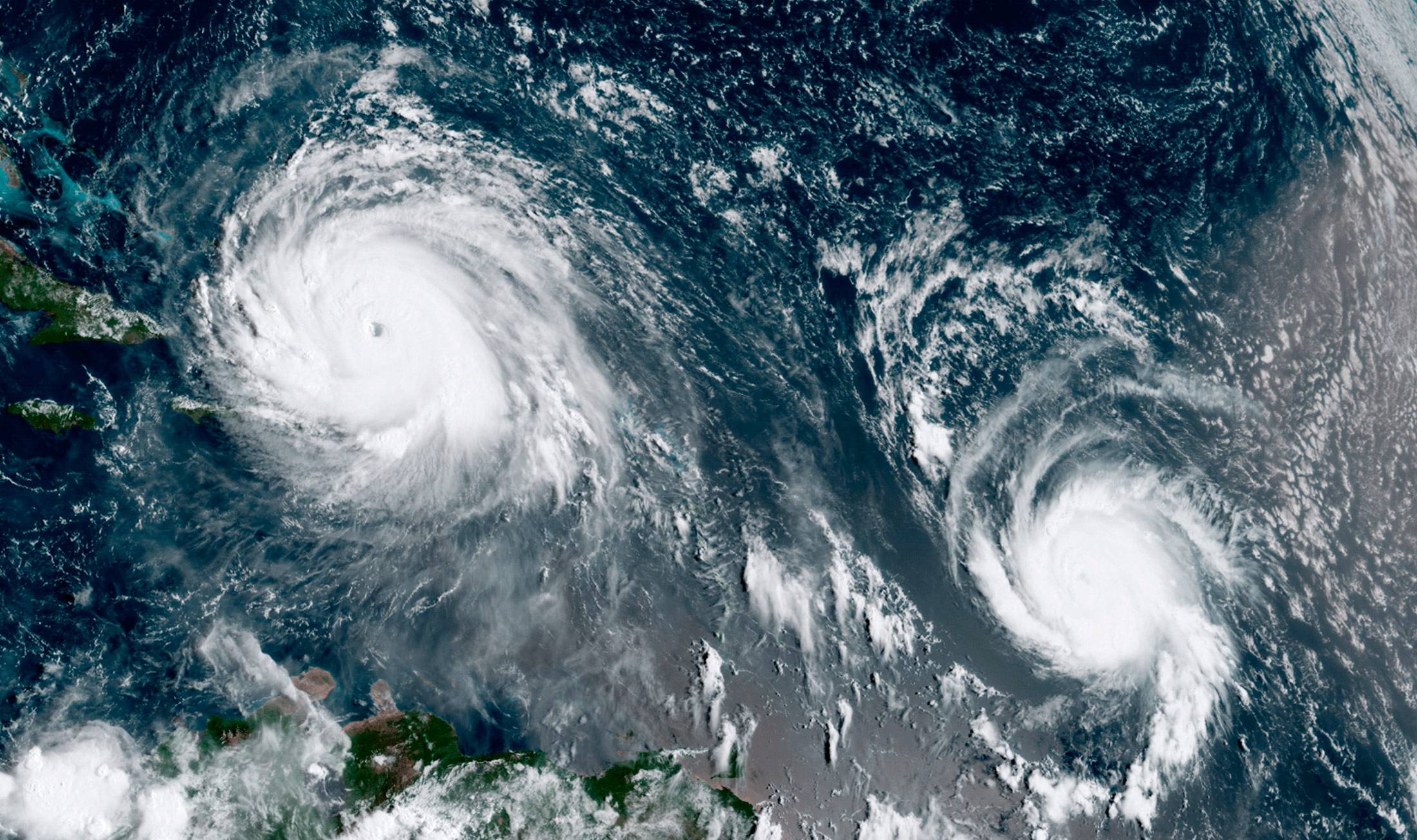 2017年9月7日拍摄的飓风厄玛(左)和飓风何塞(右)在大西洋的卫星图像。