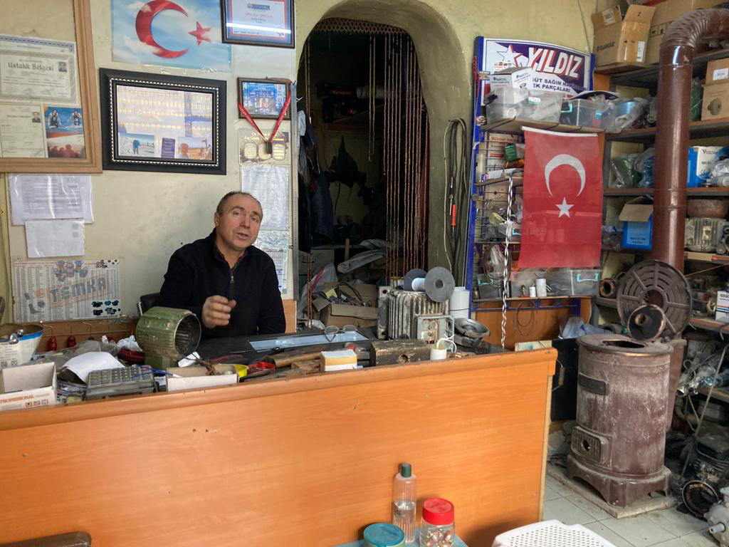 阿里·埃尔迪克在巴勒克西尔伊夫林迪。摄影师:Selcan Hacaoglu/Bloomberg在巴勒克西尔的小车间墙壁上挂满了土耳其国旗,阿里·埃尔迪克对埃尔多安的政策失误给予了宽容。