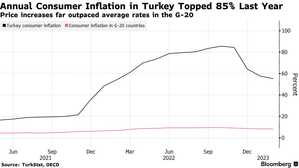 哈桑·查克尔来源:彭博社这位51岁的商人在过去21年的每次选举中都为土耳其领导人及其保守的正义与发展党投票,但与数百万其他土耳其人一样,自从埃尔多安在2018年连任后获得更多权力以来,他的生活质量已经大幅下降。过去几年来,通货膨胀猖獗,甚至在伊斯坦布尔和其他大城市超过了100%,并在2022年底达到了全国范围内的85%的高峰。