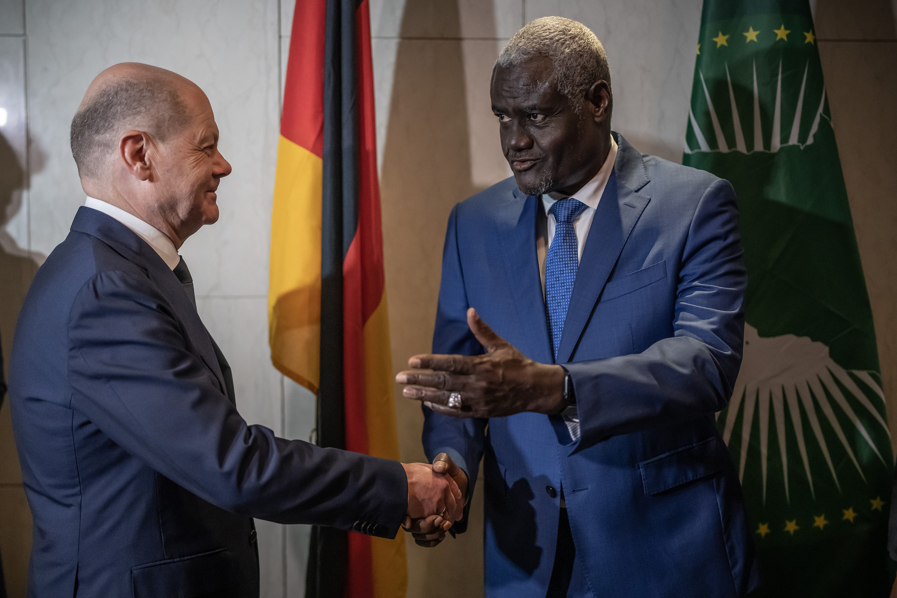 奥拉夫·肖尔茨与穆萨·法基·马哈马特在埃塞俄比亚亚的斯亚巴巴,于5月4日。摄影师:迈克尔·卡佩勒/图片联盟/盖蒂图片社德国总理奥拉夫·肖尔茨力挺非洲联盟成为二十国集团的永久成员,以便在应对气候变化等全球问题方面发挥更大作用。