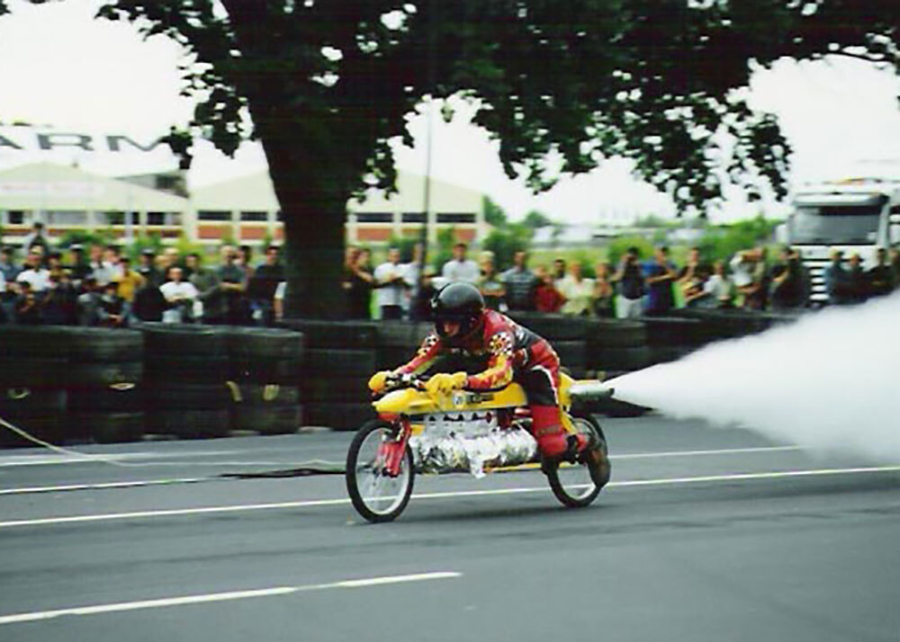 他的第一架火箭推进装置看起来像是赛车摩托车和自行车的混合体。鲜黄色的车身被拉长,把手放在前轮正上方,这意味着骑行者——贝克——会平躺,胸部几乎碰到车架,双腿伸展在后轮的两侧。下面是火箭组件,由一对包裹在锡纸中并通过一堆管子连接到发动机的推进剂气缸组成。这架火箭摩托车运行良好,速度很快。