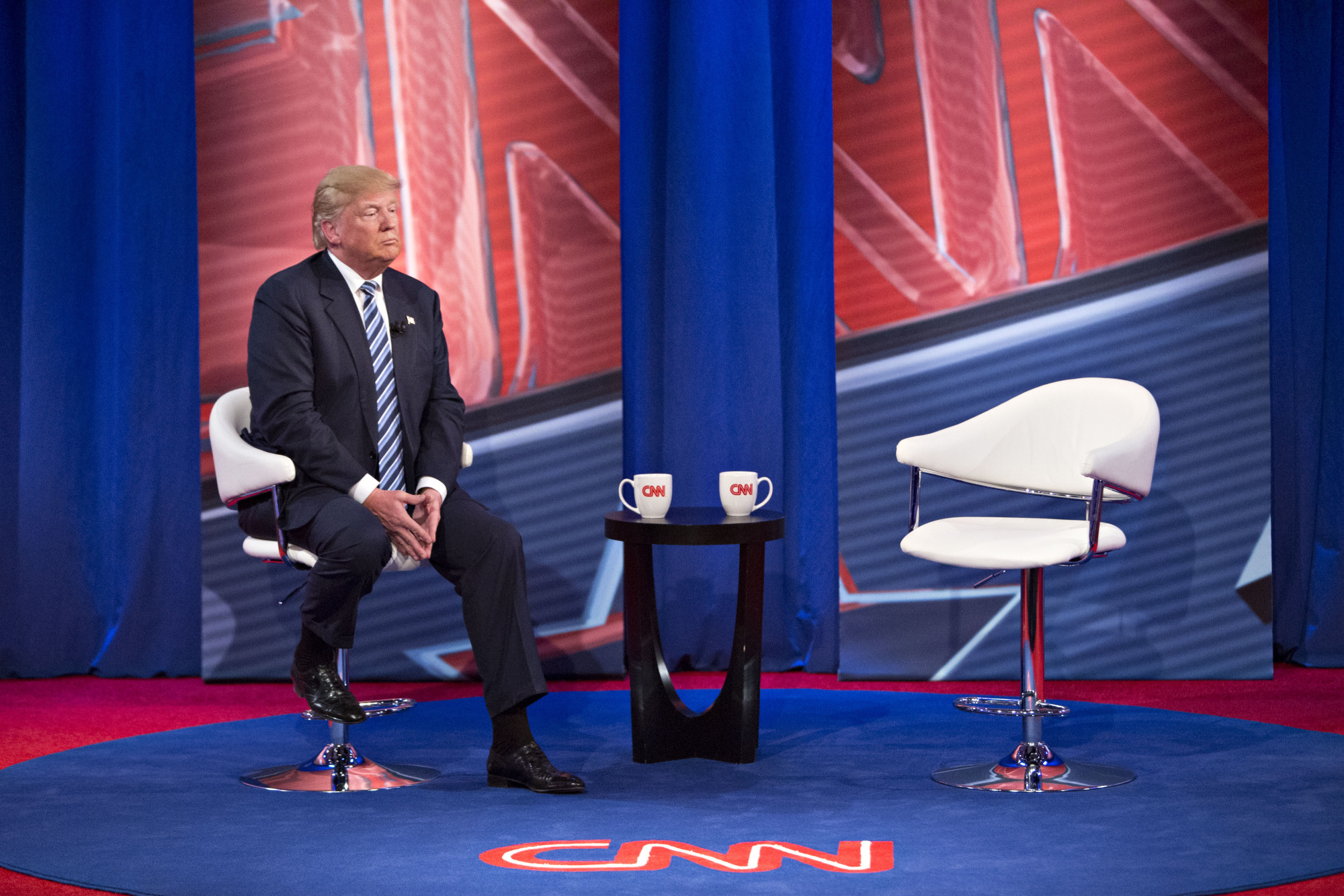 唐纳德·特朗普在2016年CNN市政厅活动中坐在舞台上。来源:民主党人表示,如果特朗普赢得提名,他的法律挑战、独立选民、郊区妇女甚至许多共和党人的不受欢迎将对他们有利。