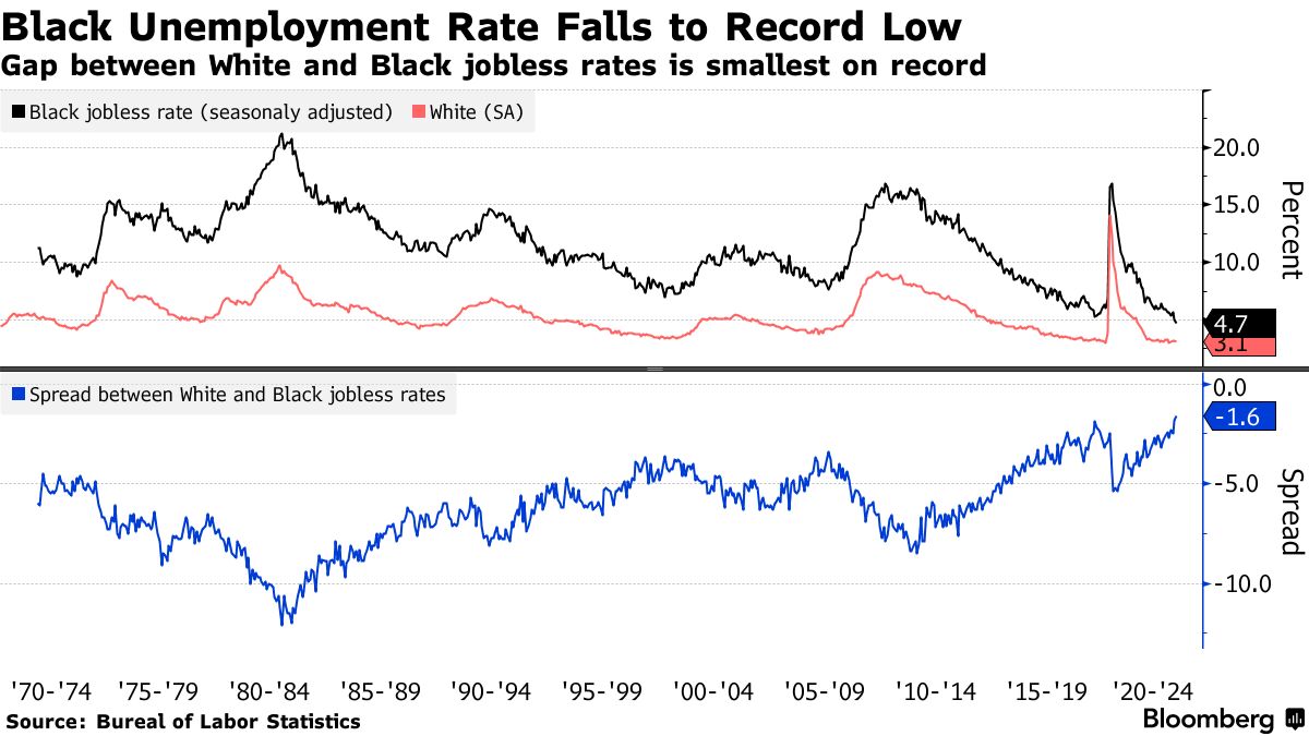 白人失业率为3.1%,黑人和白人工作者之间的差距缩小到1.6个百分点,这是自1970年代政府开始追踪数据以来的最小值。