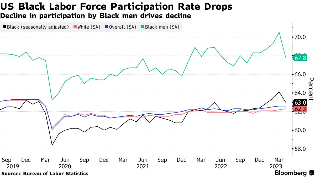 这一下降是由于黑人男性的参与率急剧下降,他们在4月以三年来最快的速度退出劳动力市场。这对于过去一年中取得强劲增长的一群人来说是一个逆转。