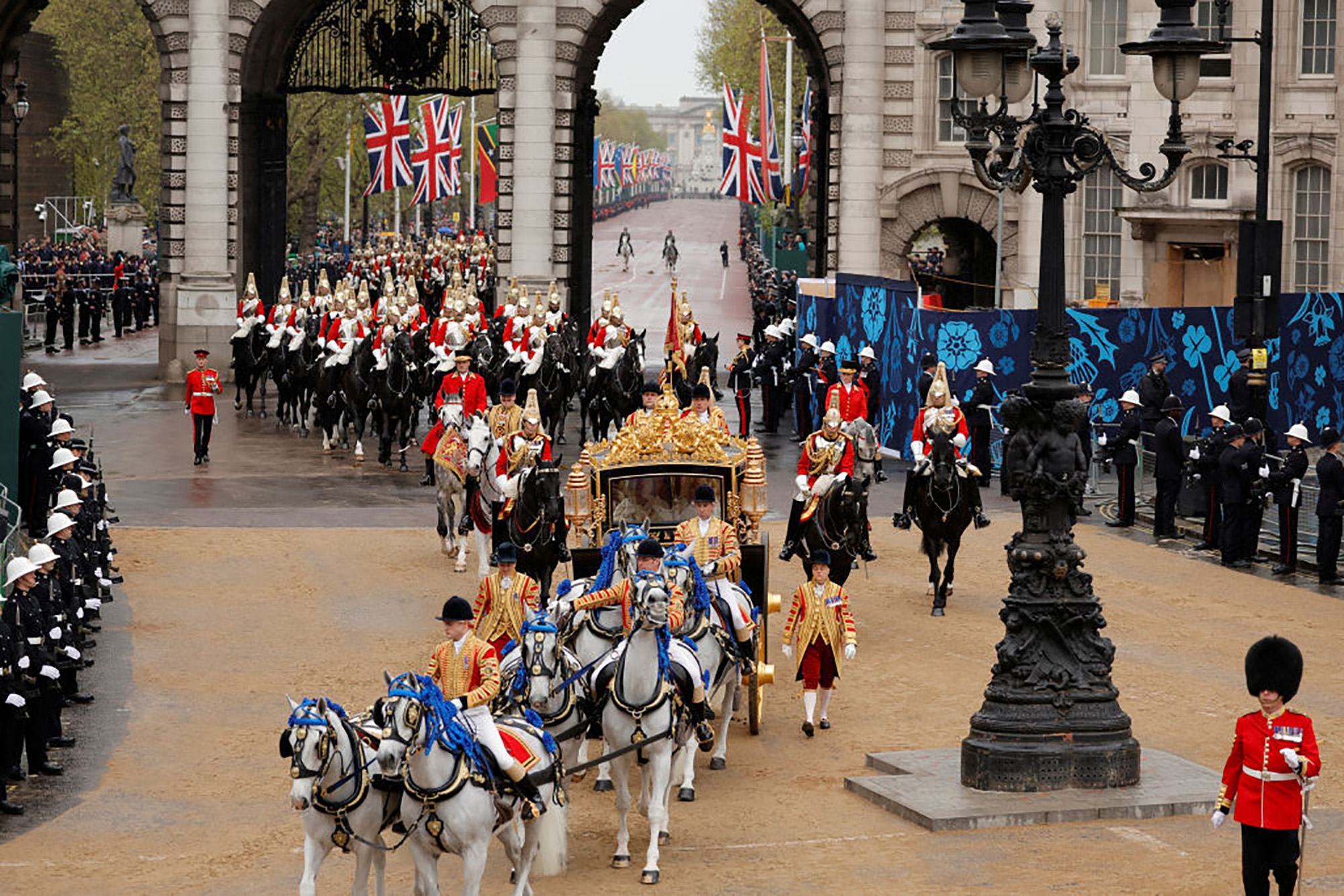 查尔斯国王和卡米拉王后乘坐钻石禧年国家教练离开白金汉宫前往威斯敏斯特教堂。摄影师:皮罗什卡·范德沃/ WPA池/盖蒂图片社这场壮观的活动包括军事游行,皇室夫妇乘坐自1831年以来每次加冕典礼都使用的金色国家教练兜风,以及大量的“国王万岁!”的呼喊声。天气允许的话(目前看起来相当危险),这场活动将以数十架飞机飞越白金汉宫结束 — 包括红箭飞行表演队。