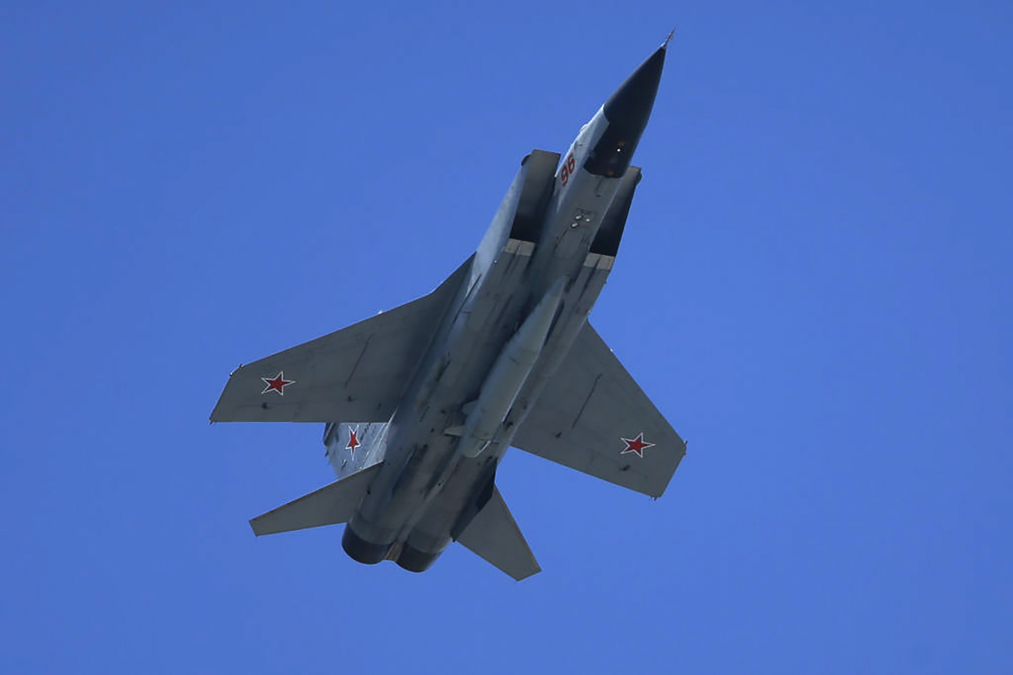 MIG-31k战斗机,携带“匕首”导弹系统,在红场庆祝胜利日时进行表演。
