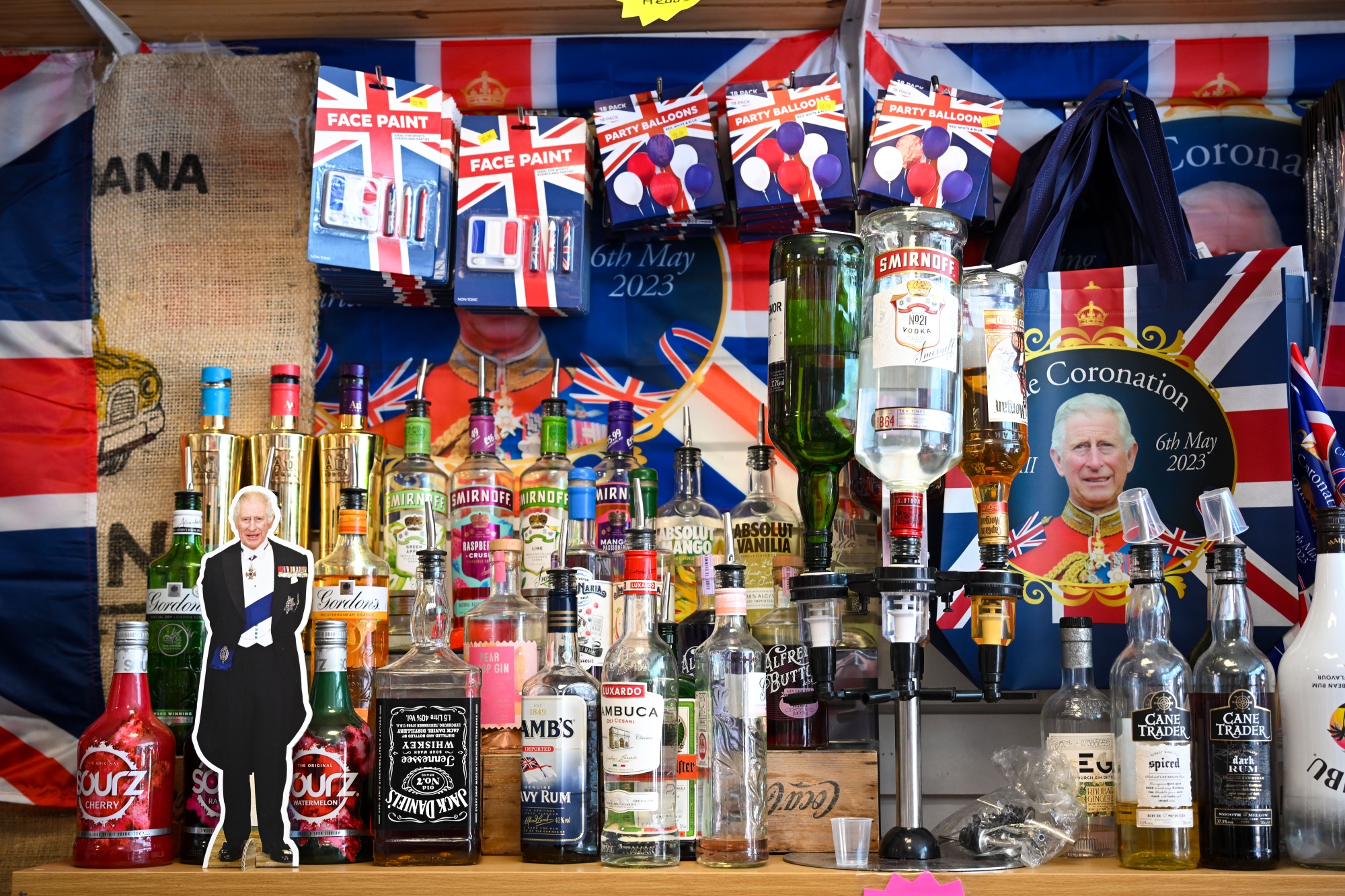 查尔斯三世加冕纪念品和韦茅斯礼品店的酒精饮料。