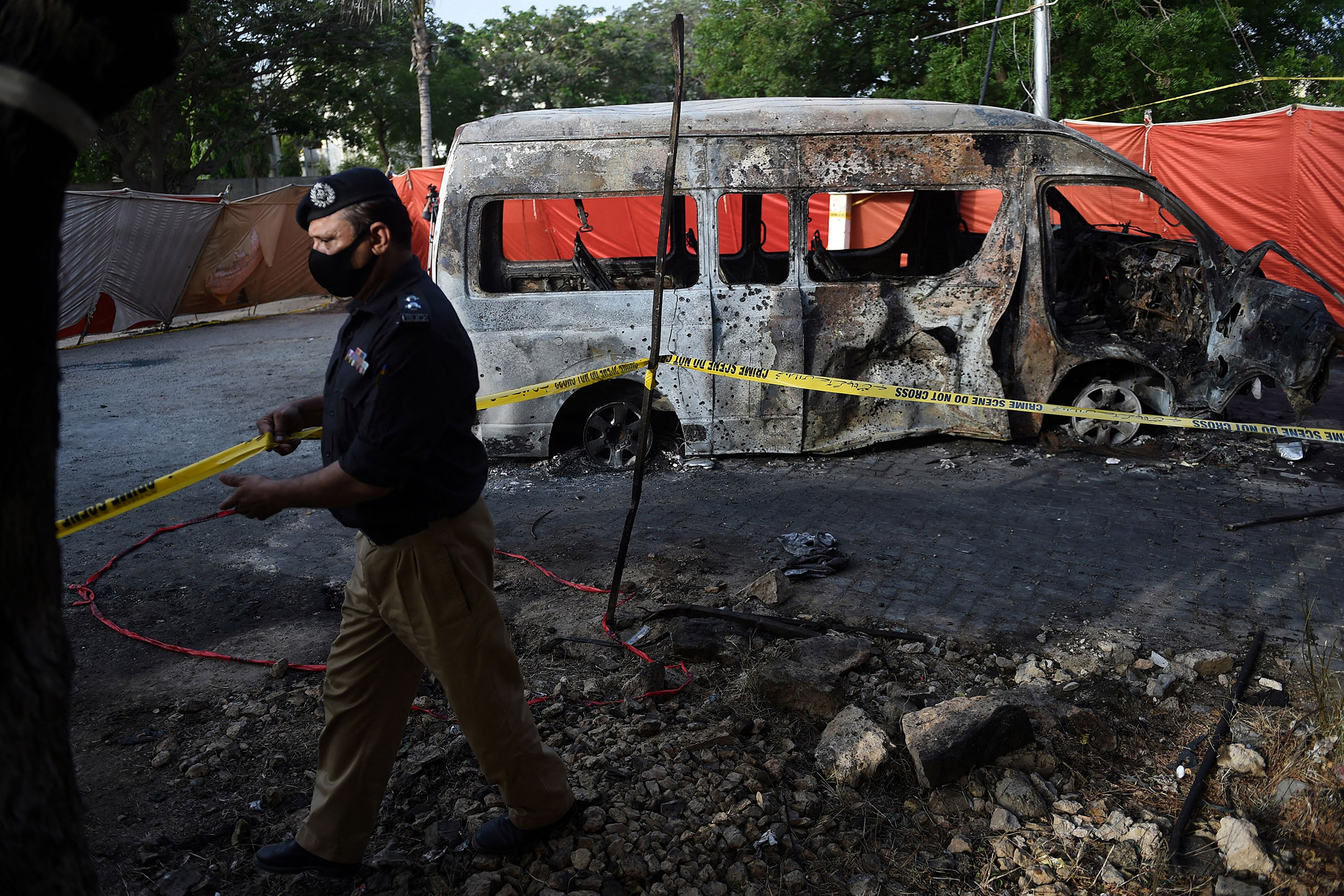 警方在自杀袭击发生后的第二天,于2022年4月27日在卡拉奇的卡拉奇大学附近的孔子学院(中国在世界各大学开设的文化项目)附近保护爆炸现场。