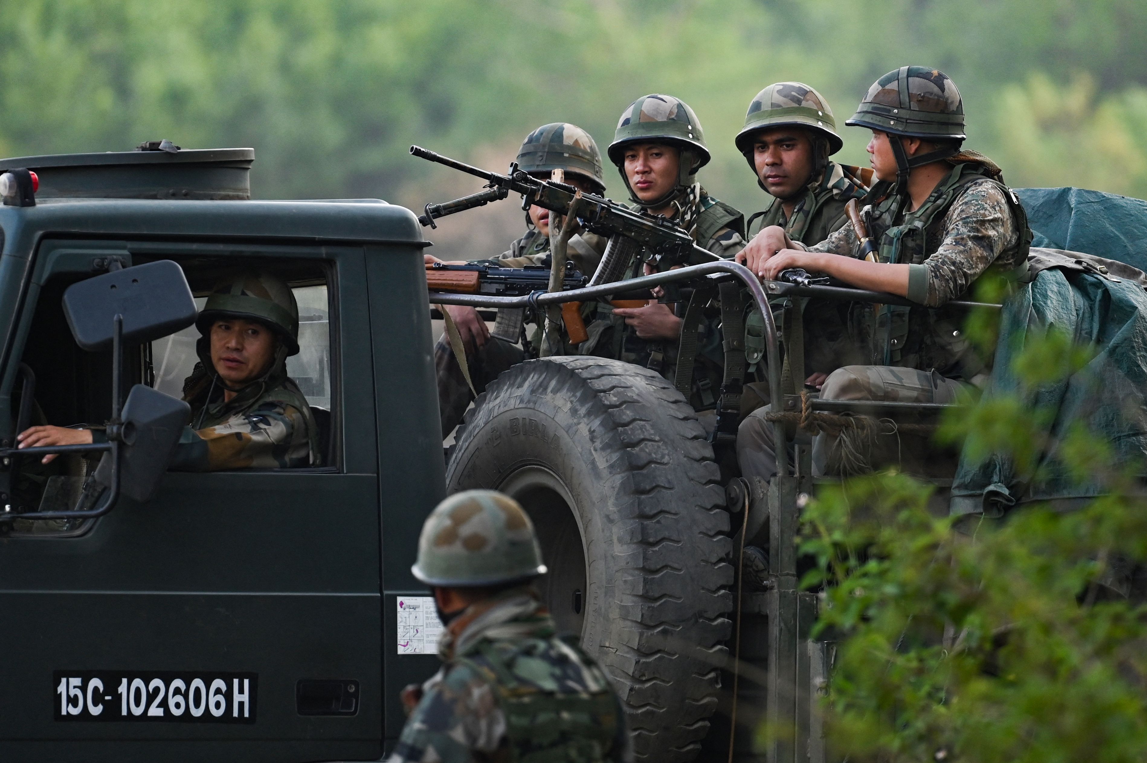 印度陆军士兵在印度Imphal附近的一次救援行动中巡逻,该行动是为了应对该地区的种族暴力事件,发生在5月7日。