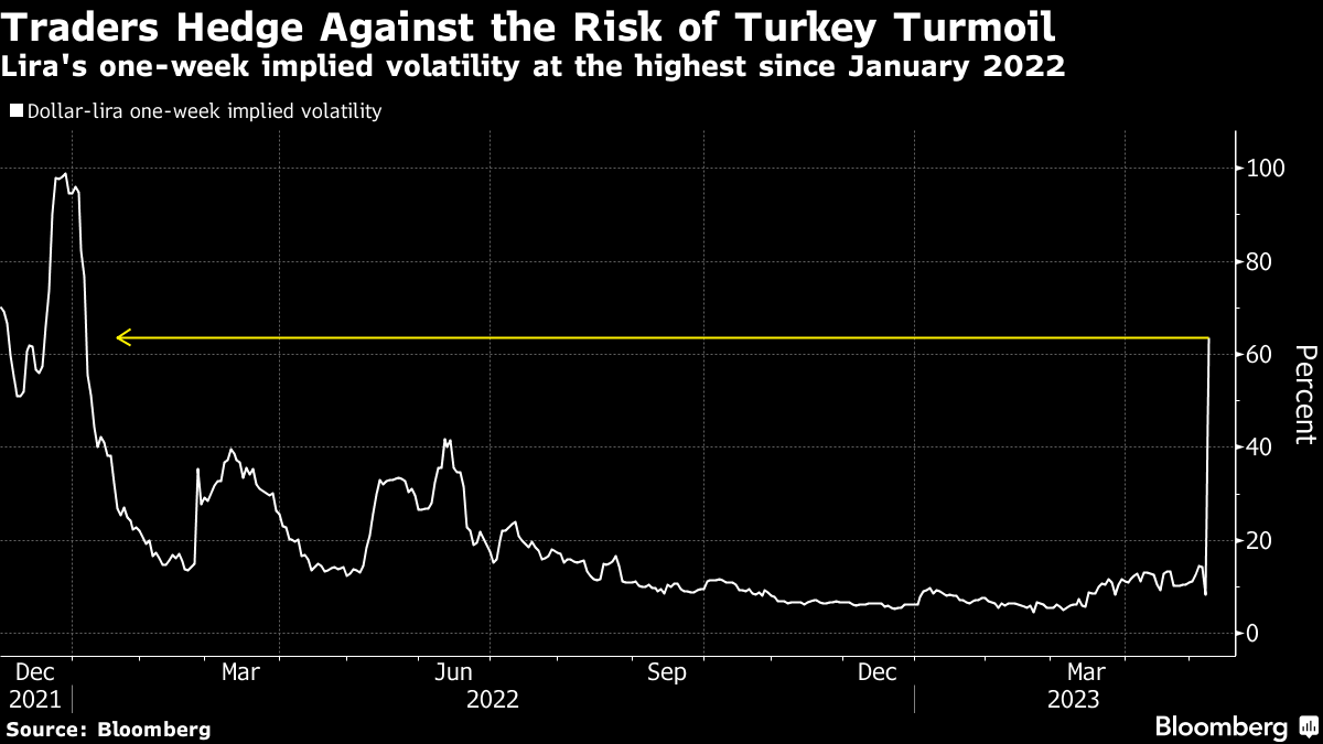 波动激增: 交易员正在加大对里拉动荡的保护,使货币预期波动率在选举前一周达到全球最高水平。