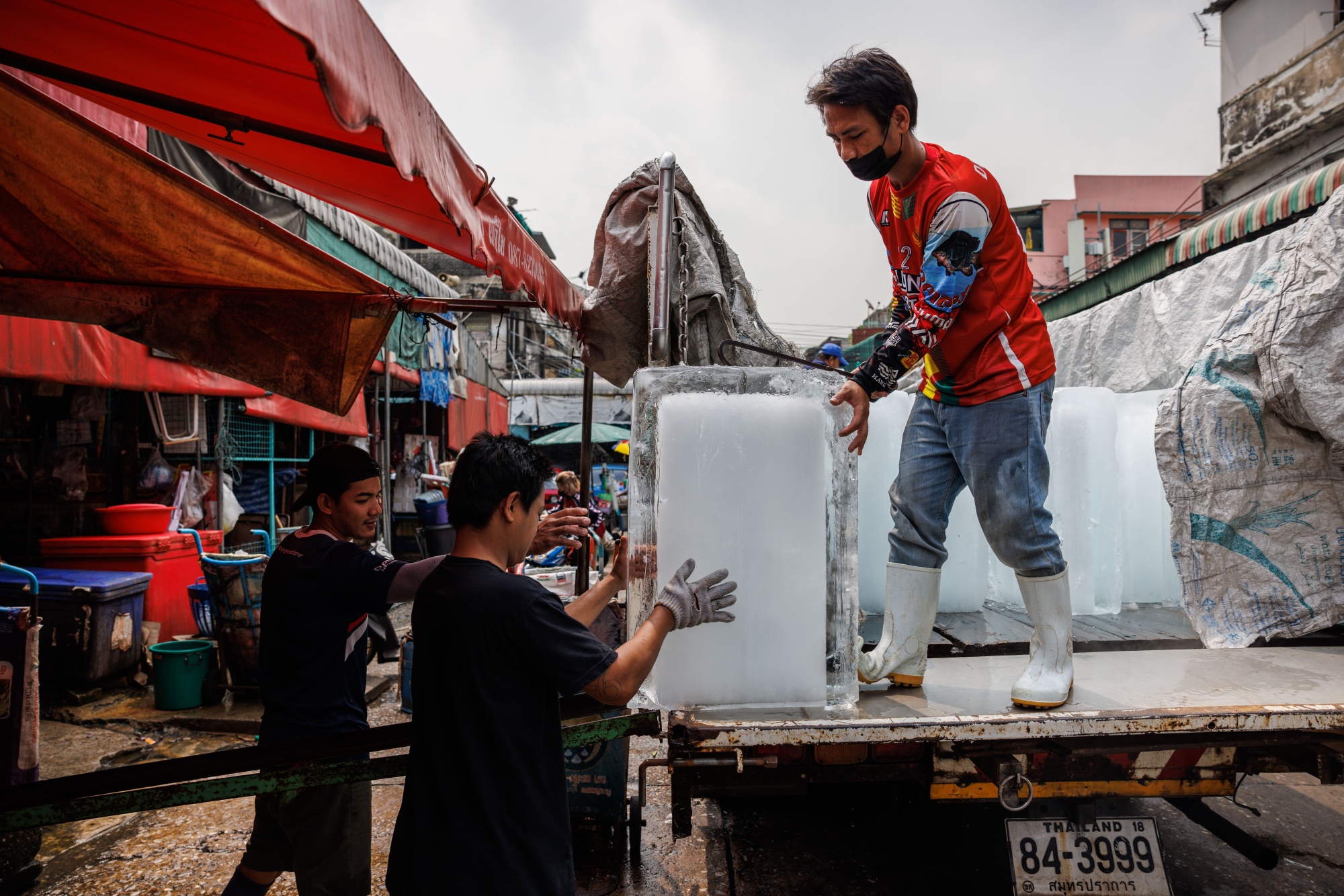 工人在四月下旬的曼谷湿巴市场卸载一块冰块,当时正值一场热浪袭来。摄影师:安德烈·马莱尔巴/彭博社将其视为一个警告:尽管美国迎来春天,但像越南和老挝这样的亚洲国家已经酷热难耐。