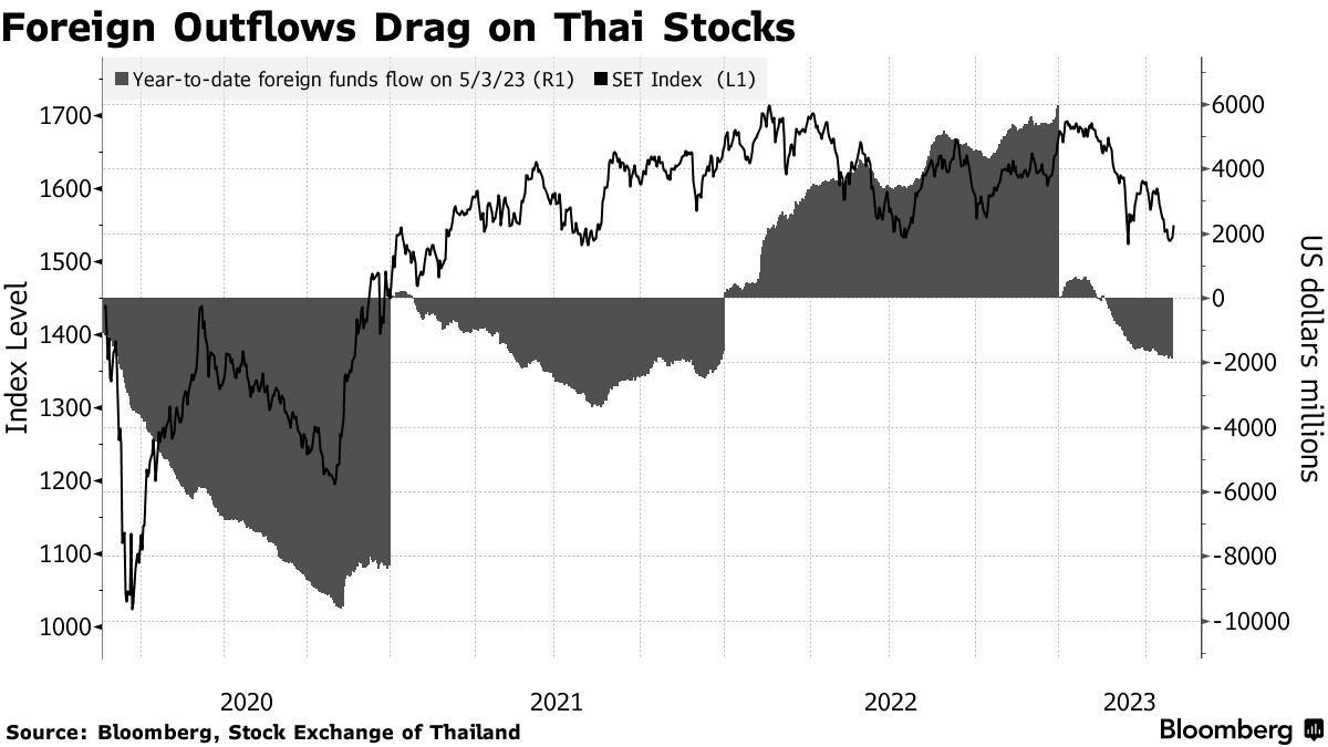 泰国SET指数在2023年下跌了6.4%,违背了此前大选前的涨势预期。相反,外国投资者已经撤出了近18亿美元,因为泰国的经济增长前景落后于东南亚同行,央行的收紧政策是一个主要拖累因素。