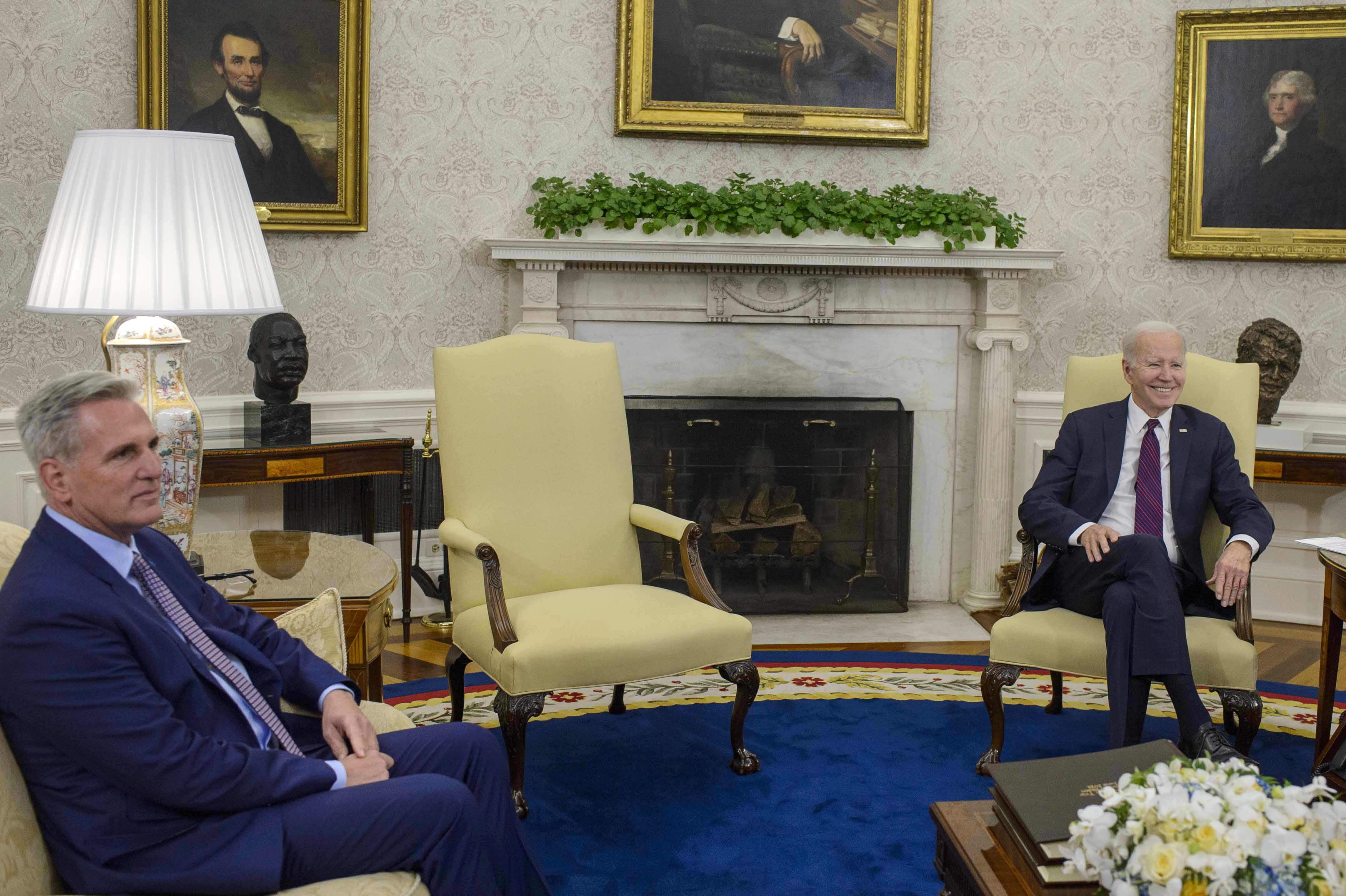 乔·拜登在5月9日与美国众议院议长凯文·麦卡锡在白宫椭圆形办公室会面。摄影师:邦妮·卡什/UPI/彭博社拜登表示,如果谈判“临近最后时刻”,他将留下直到问题解决。