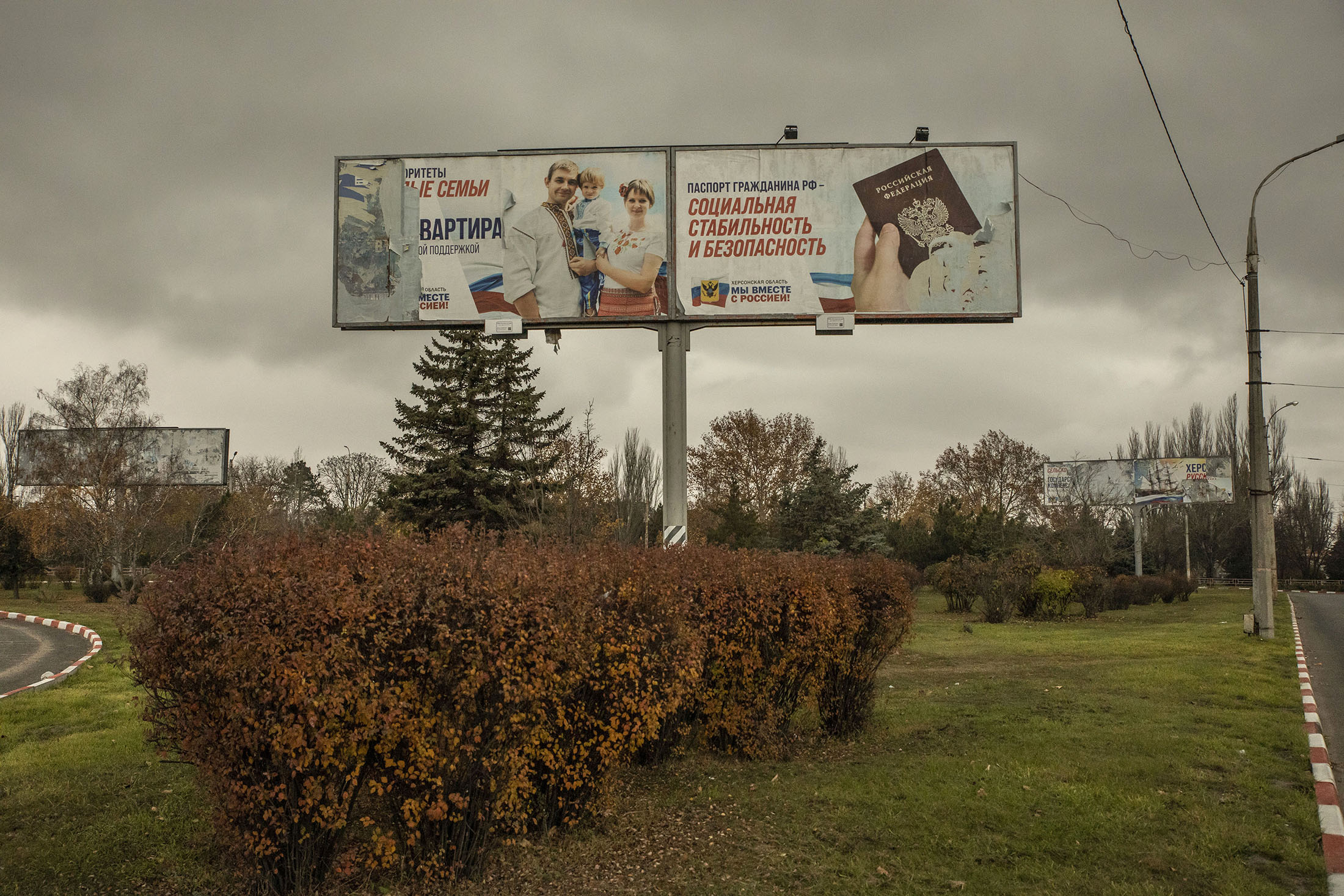 2022年11月16日,赫尔松市的两块广告牌。右侧的广告牌上写着:“俄罗斯联邦公民护照意味着社会稳定和安全!赫尔松地区,我们与俄罗斯同在。”摄影师:亚历西奥·马莫/卫报/eyevine/盖蒂图片社莫斯科还向俄罗斯人提供财政诱因,鼓励他们搬到这些地区,取代被驱逐的乌克兰人。那些仍然生活在这些领土上的乌克兰人正受到压力,要求他们接受俄罗斯护照,被占领的赫尔松地区的居民被警告,任何到6月仍不接受护照的人将被驱逐并且财产被没收。