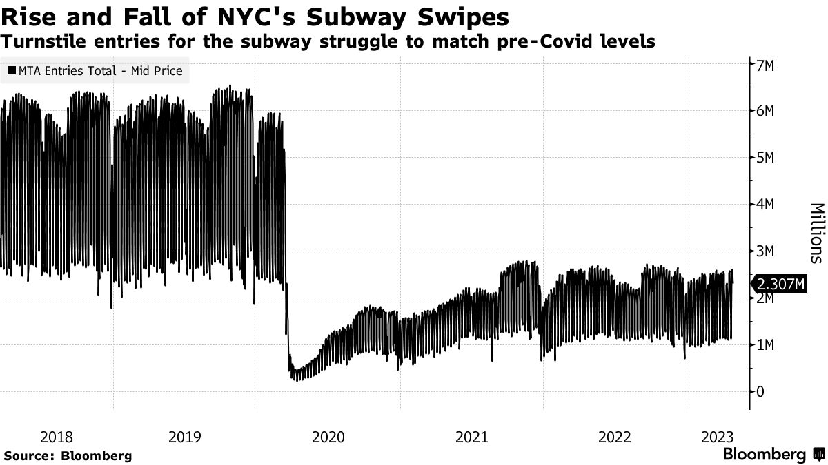 纽约的大都会运输署,美国最大的大众运输系统,估计可能要到2026年才能使全系统乘客量达到2019年使用量的80%。