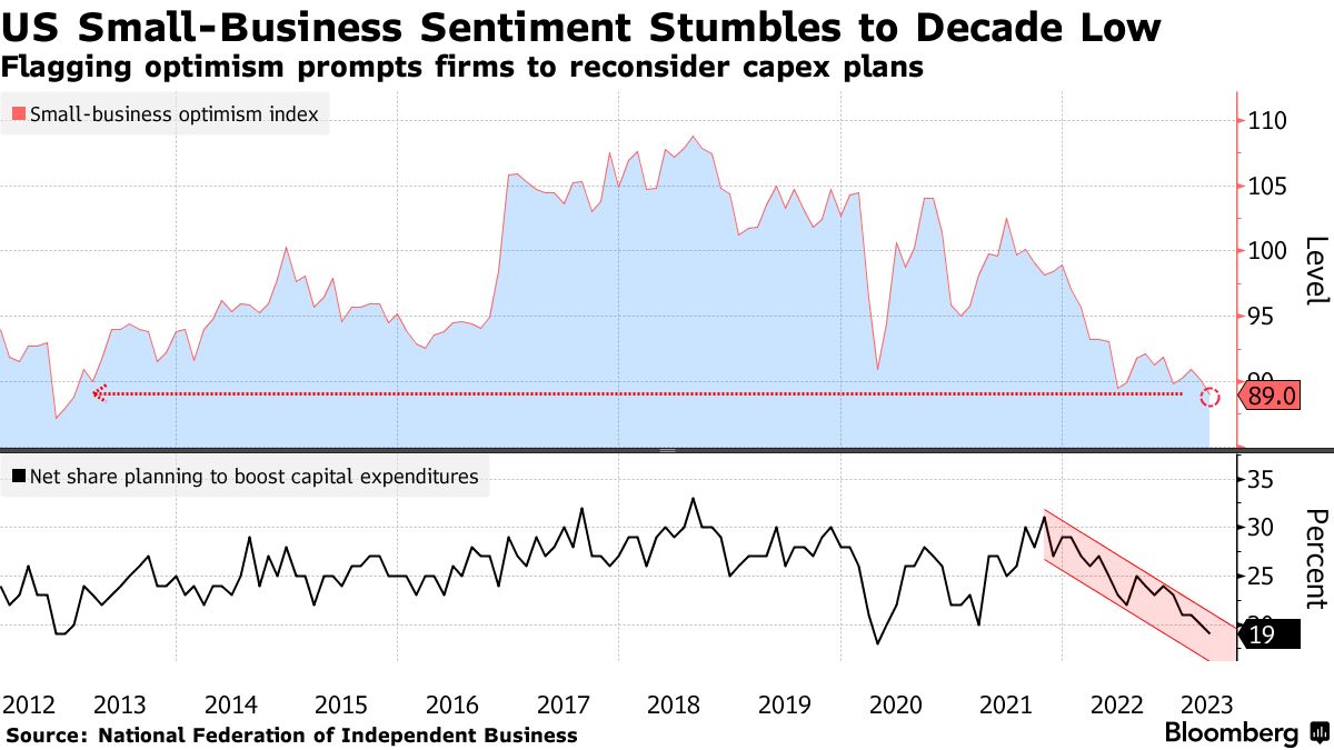 美国小企业乐观情绪降至十年来最低水平 - 彭博社