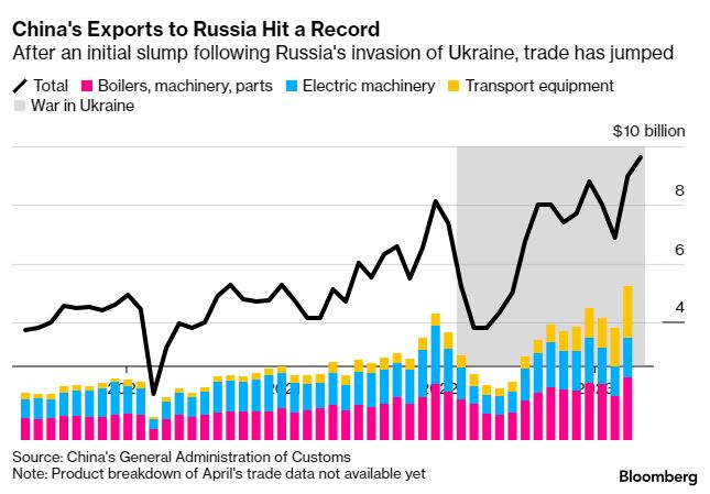 4月份对俄罗斯的出口创下纪录,同比增长153%,达到96亿美元。中国与俄罗斯的贸易关系受到越来越多关注,欧盟提议对几家协助俄罗斯的中国公司实施限制。
