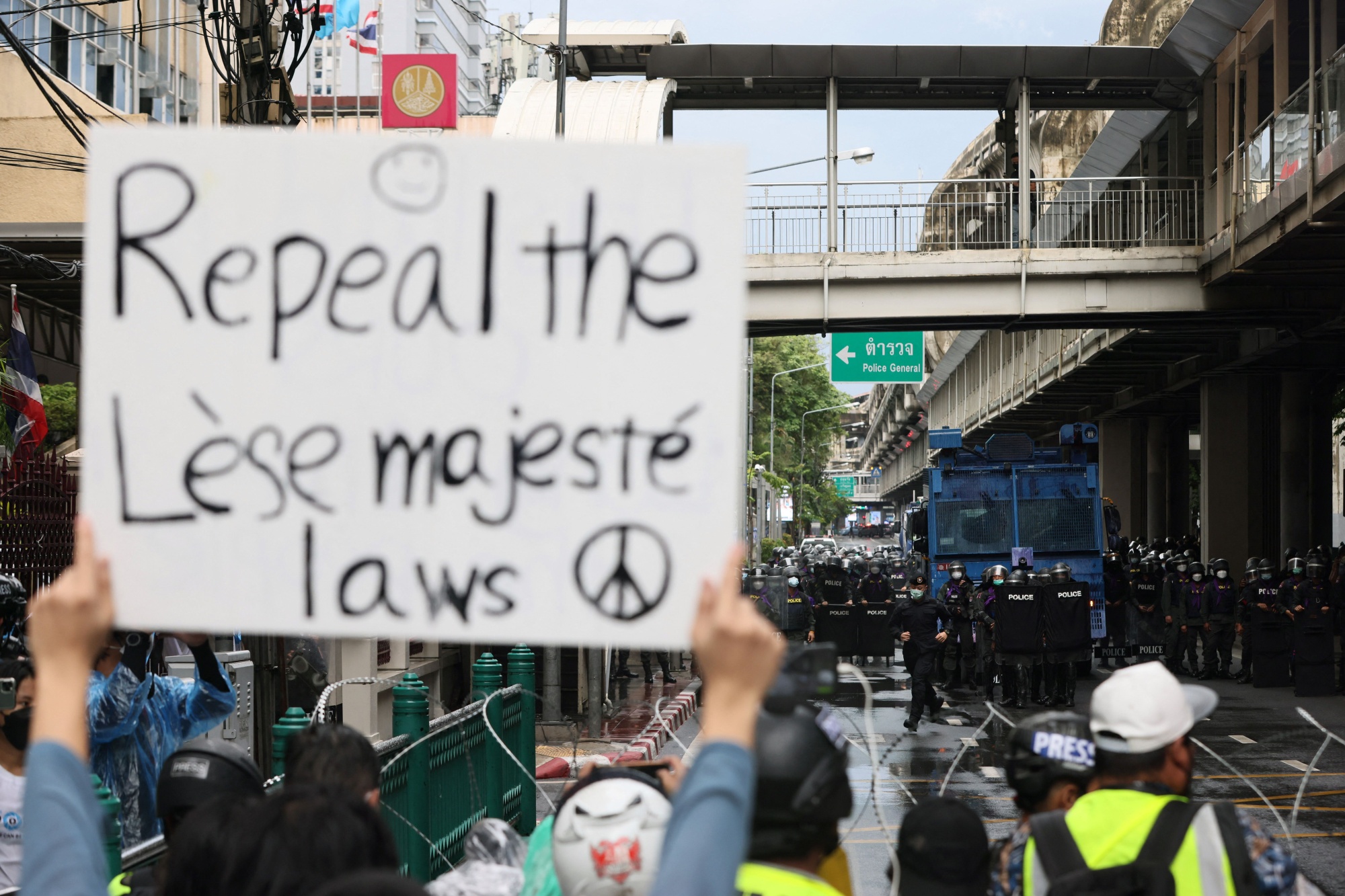 几分钟后,警察将25岁的苏塔维·索伊卡姆制服并按倒在地。尽管当晚他只被控公共破坏罪,但几天后,他因为一篇旧的Facebook帖子被逮捕,被指控违反第112条,这是一项被称为“诽谤国王罪”的法律,如果被判有辱国王或其他几位高级王室成员,可能会被判入狱长达15年——而他正是在抗议这项法规。