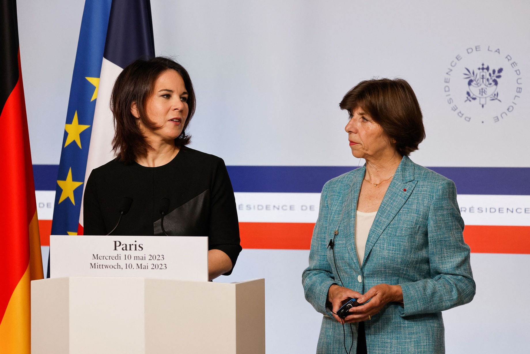 Annalena Baerbock 和 Catherine Colonna 在 5 月 10 日在巴黎爱丽舍总统府举行的会议上。摄影师:Ludovic Marin/AFP/Getty Images法国和德国的外交部长试图展示对中国的统一立场,称他们的国家必须减少对世界第二大经济体的依赖,并呼吁北京向俄罗斯施压,结束其在乌克兰的战争。