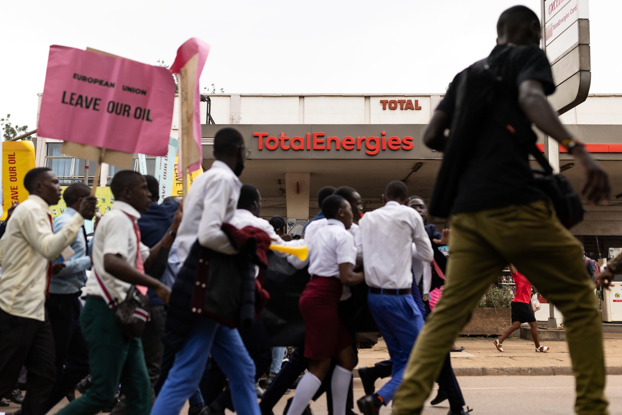 学生们在坎帕拉抗议欧盟撤回他们对东非原油管道项目的担忧。