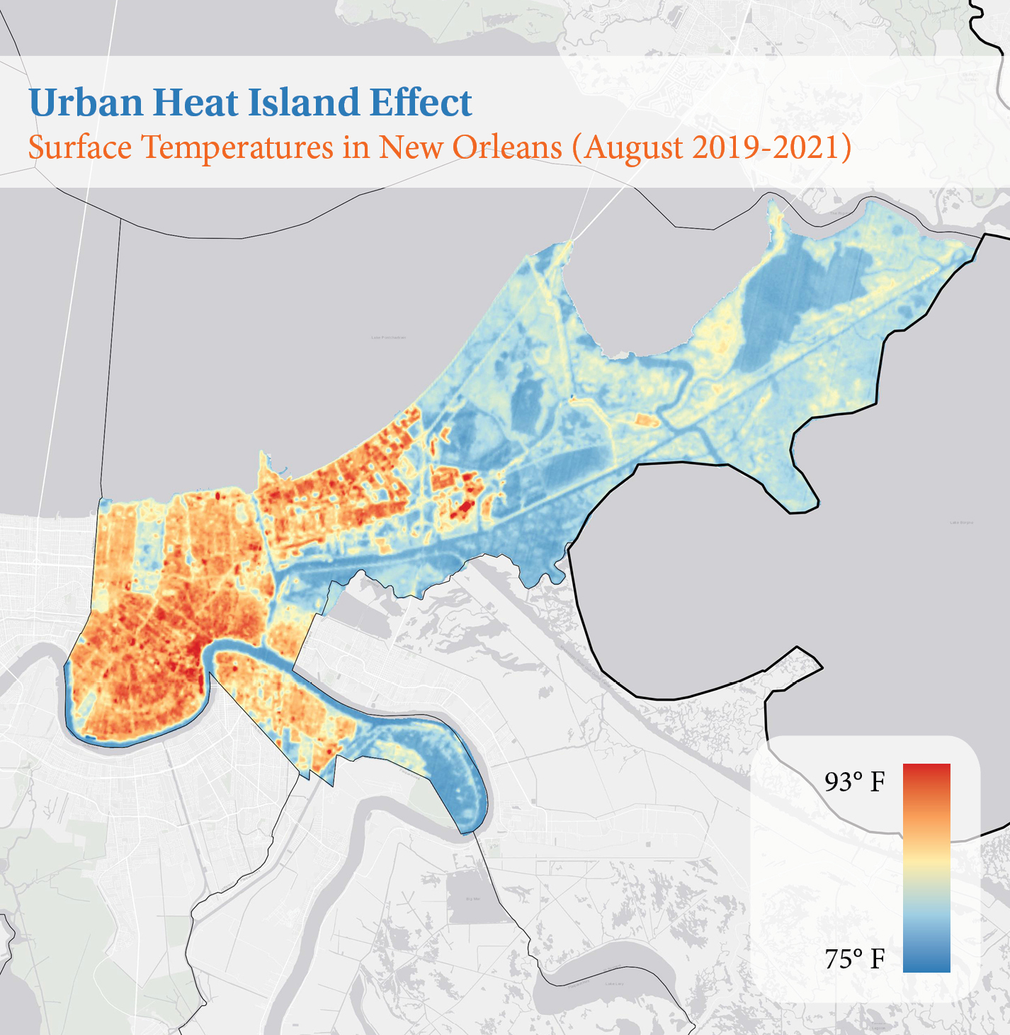 与其他城市一样,树木覆盖的缺乏与种族和阶级模式有关:低收入社区往往树木较少,健康状况也较差。新奥尔良拥有美国最严重的城市热岛效应,整个城市比周围景观热约9度。这种效应在SOUL报告中确定的砍伐森林的社区中最为显著,如中央城和爱尔兰区,这些地区可能比花园区和约翰湾地区等绿树成荫的地区热18度。