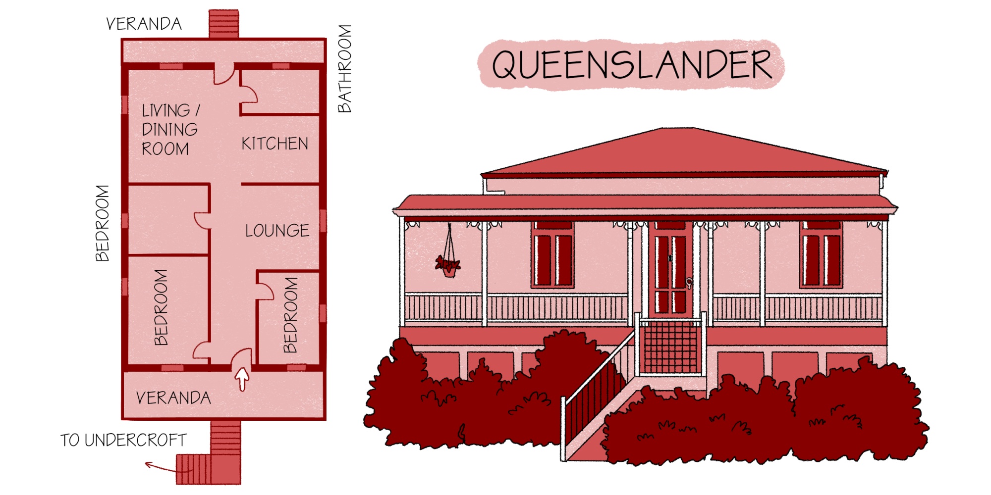 粗糙但常常优雅的建筑物建于19世纪末至第二次世界大战期间,昆士兰人在其最精致的时候就像是通风良好的木制帐篷,是全日生活的花园亭。在最实用的情况下,这些轻便的住宅只是尽可能少的临时部署。它们被建在木柱(或“桩”)上方,其朴素的锡或铁斜屋顶悬挂在细木框架上,形成了自身作为日常生活空间的走廊。
