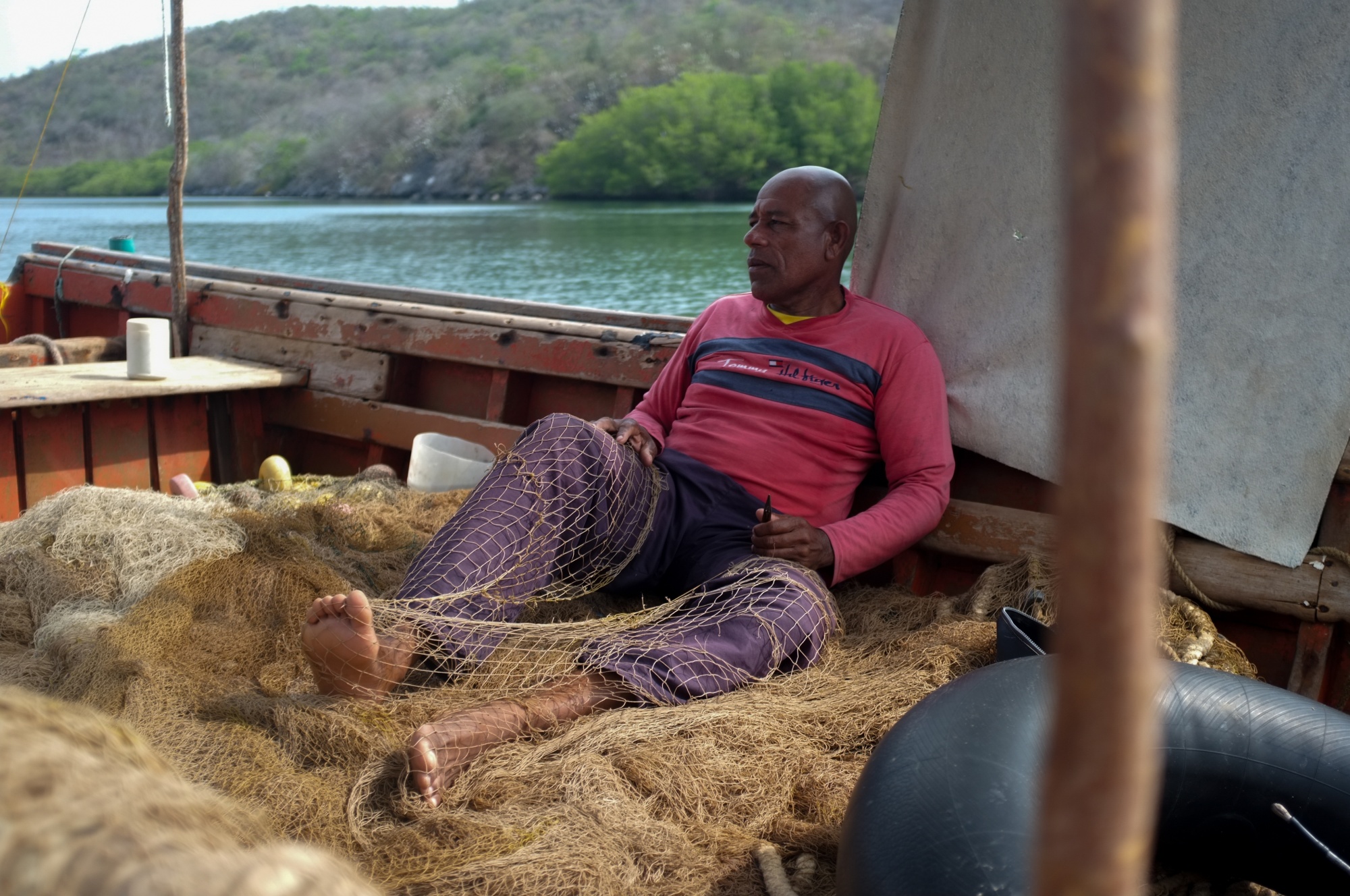 在安索阿特吉州的瓦列塞科小镇,当地渔民塞莱斯蒂诺·卡瓜纳坐在一艘船上,用手修补网眼。塞莱斯蒂诺说他一辈子都是渔民,从未见过像现在这样少的鱼。