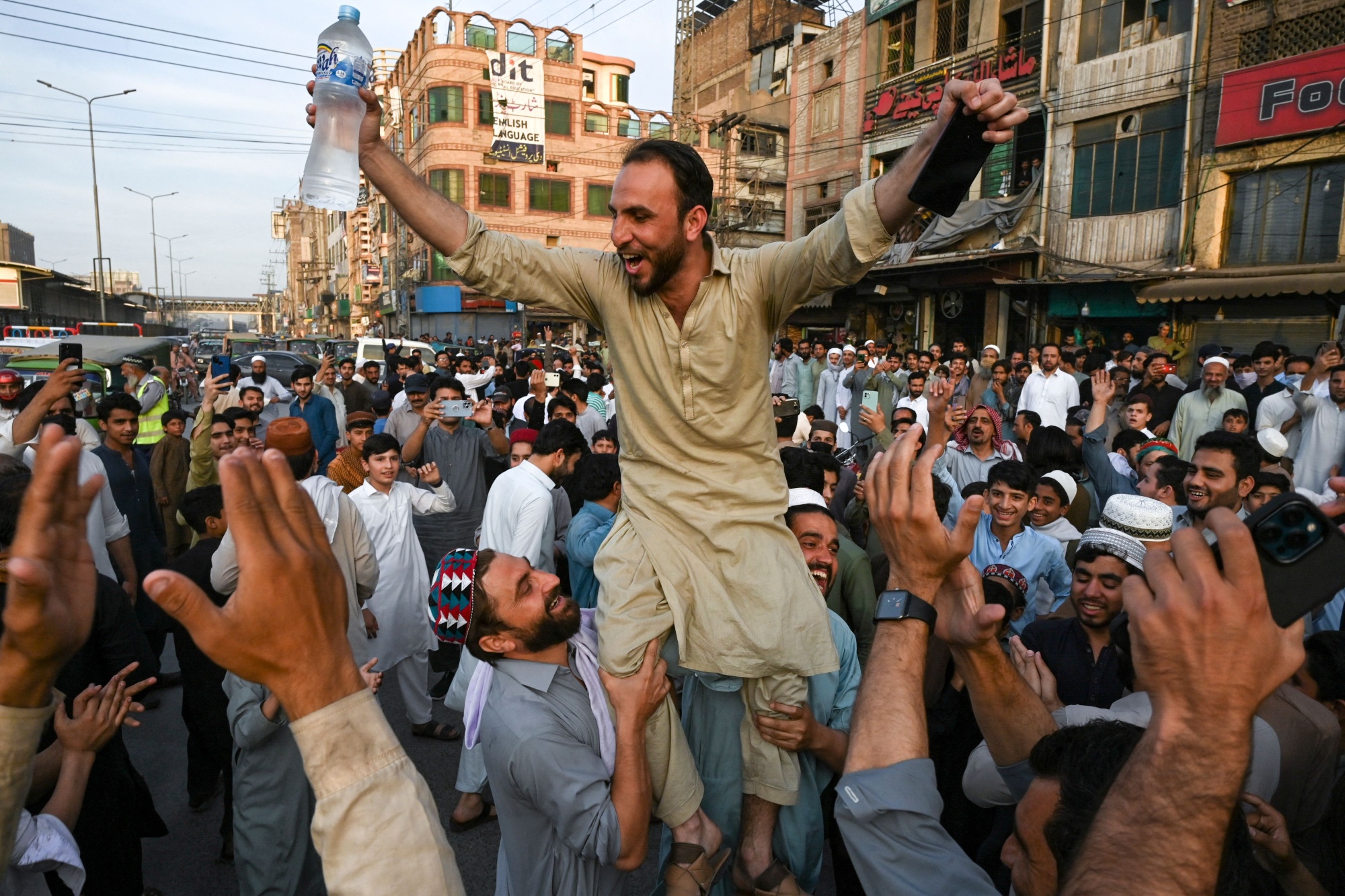 巴基斯坦正义运动(PTI)党的活动人士和支持者在5月11日在白沙瓦庆祝伊姆兰·汗。摄影师:阿卜杜勒·马吉德/法新社/盖蒂图片社