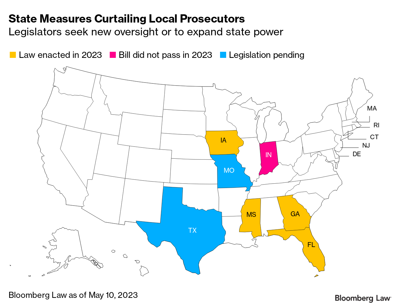 新提案的反对者正在反击:上周密苏里州民主党人阻止了一项法案的投票,该法案赋予该州在圣路易斯更多的检察权。得克萨斯州的美国公民自由联盟正在游说反对本月的法案,而爱荷华州的县检察官批评了一项法律,该法律规定州检察长可以在任何地方起诉犯罪,甚至无需请求。