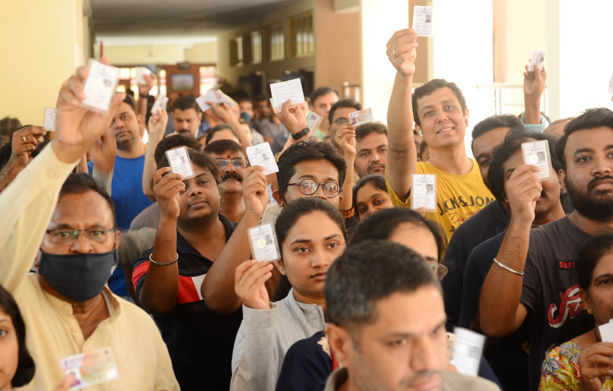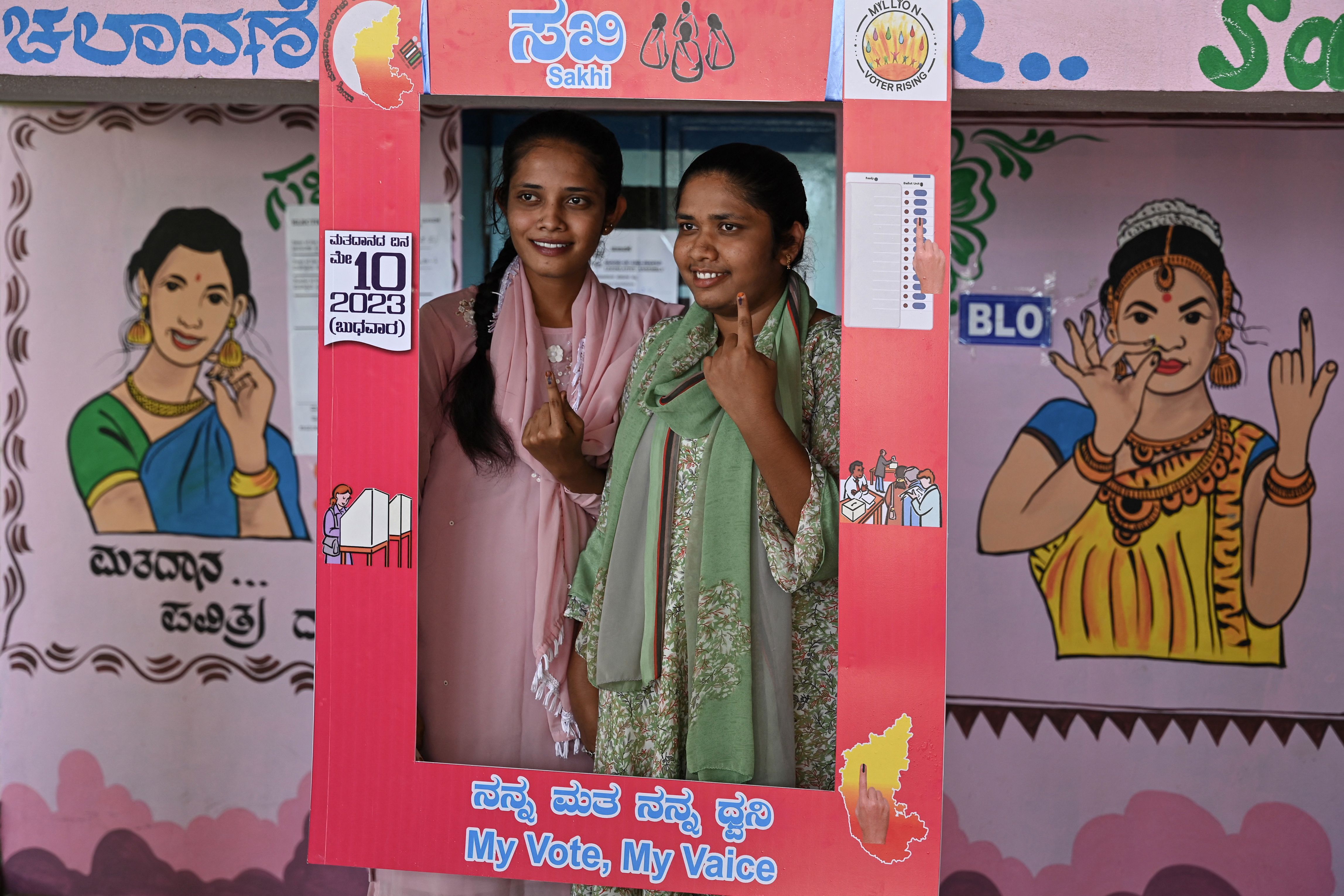 选民们在2023年5月10日的印度卡纳塔克邦议会选举中,在班加罗尔农村地区投票后,在一间照相亭里拍照。