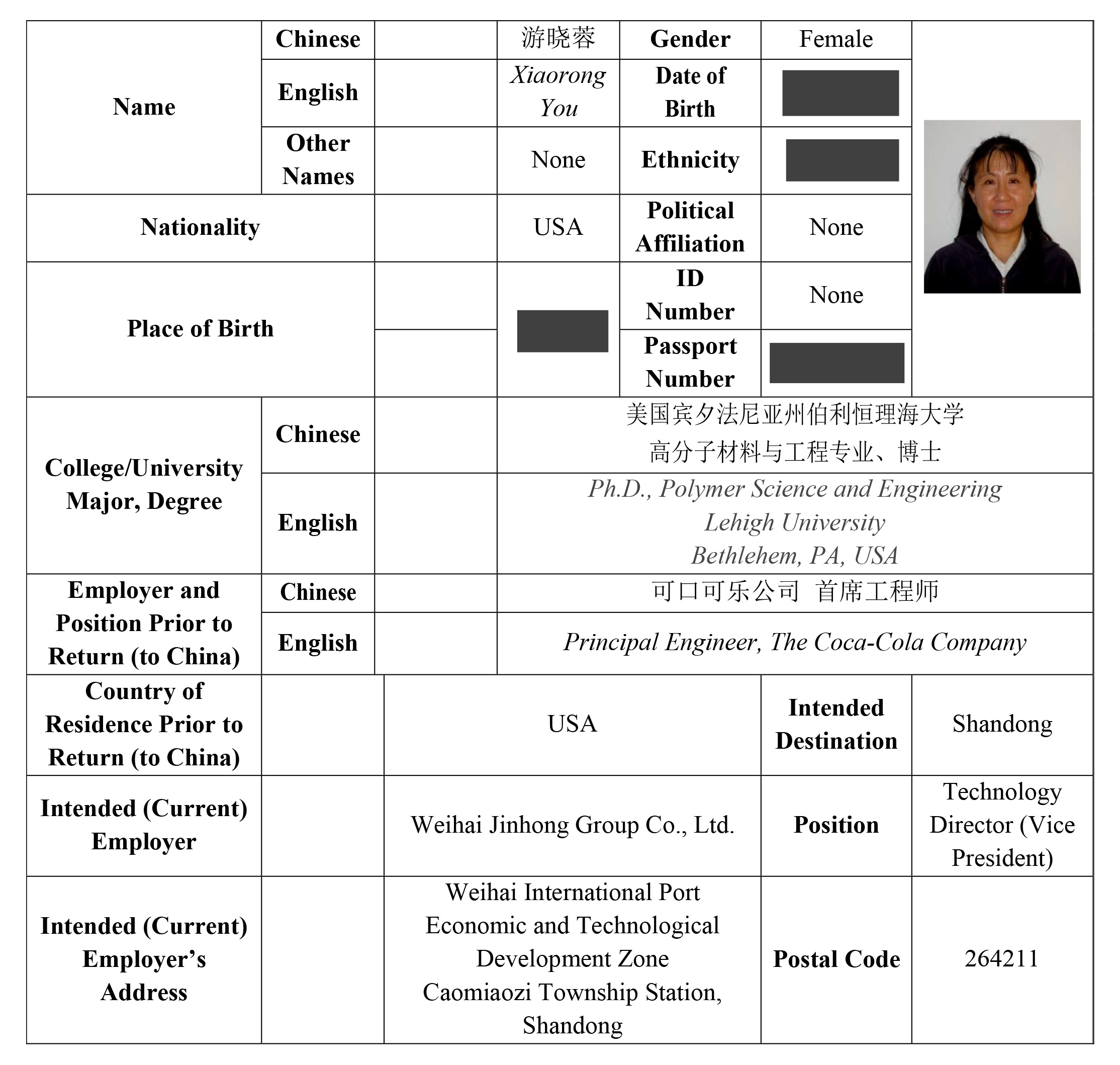 2017年3月至8月,尤在可口可乐的工作即将结束时,刘开始为申请资助创造一个更成功的版本。一些润色纯粹是为了外表:在一条微信消息中,刘要求尤重新拍一张申请照片。“如果你能把头发弄整齐一点,”他写道,“那就太好了。”其他改进则更为重要。3月,刘要求尤提供一封可口可乐的雇佣证明信,上面标明她是公司的首席技术官,一个虚构的晋升。起初她犹豫了,但后来在为她的千人计划申请准备的PowerPoint中,她自称曾“在六家不同的财富500强公司担任首席技术官或技术总监”,这个描述只有在非常宽松的“或”定义下才是真实的。最重要的是,尤的申请虚假地声称她本人“制造了世界上最先进的第二代BPANI涂层生产和制备技术”。