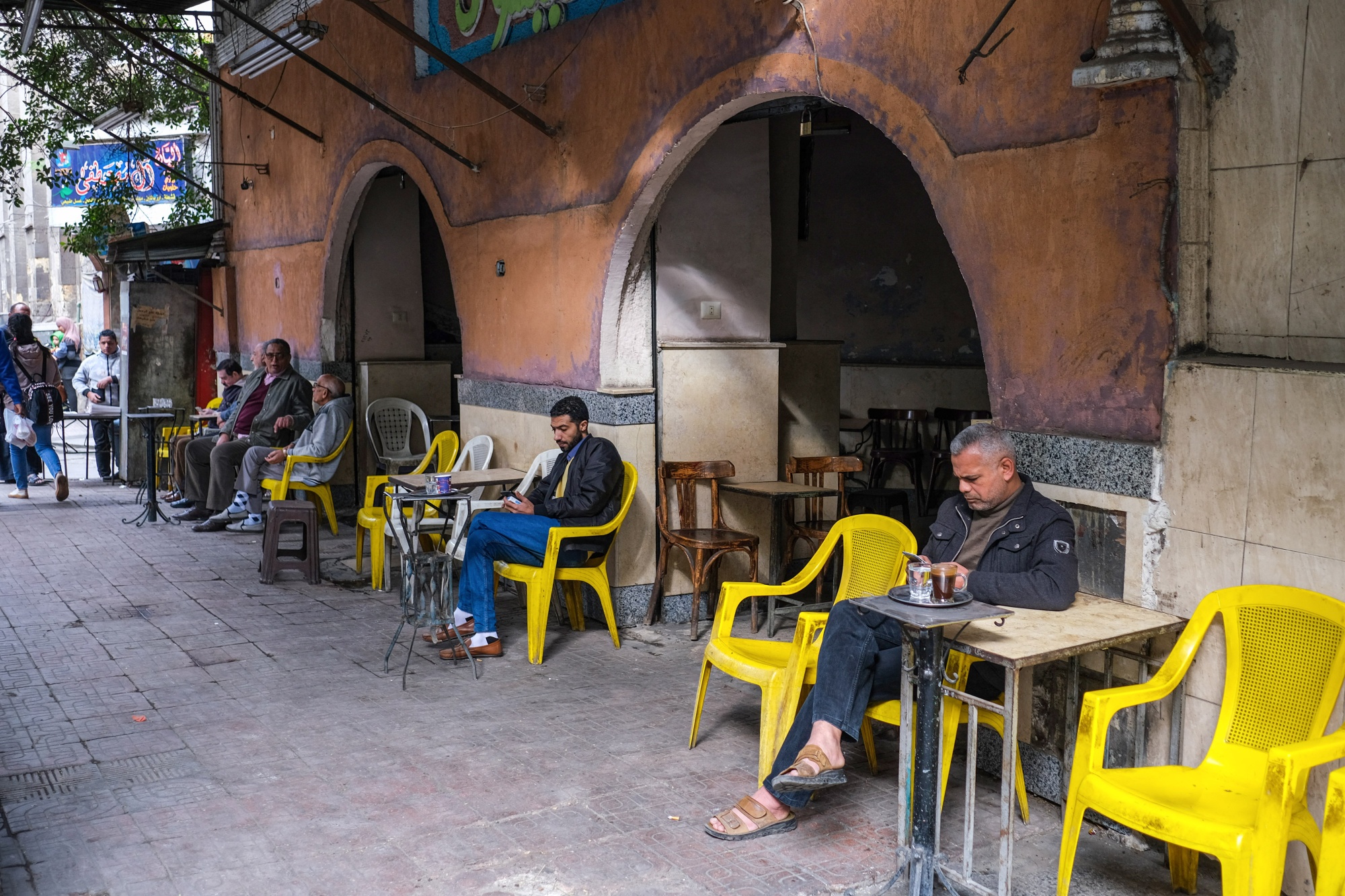 餐厅客人在开罗一家咖啡馆外使用手机。