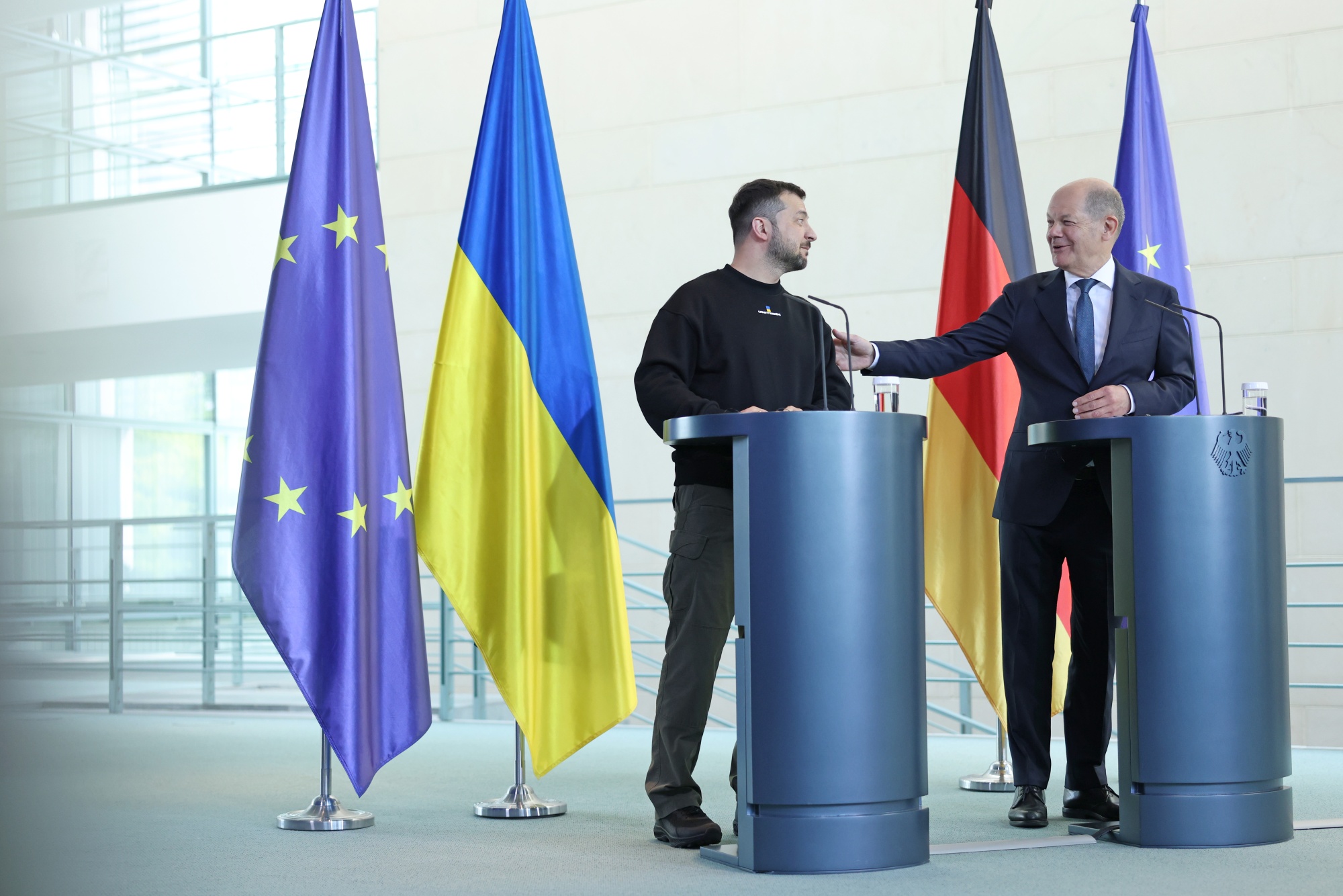 弗拉基米尔·泽连斯基和奥拉夫·肖尔茨在柏林握手。摄影师:Liesa Johannssen-Koppitz/Bloomberg### 主要进展