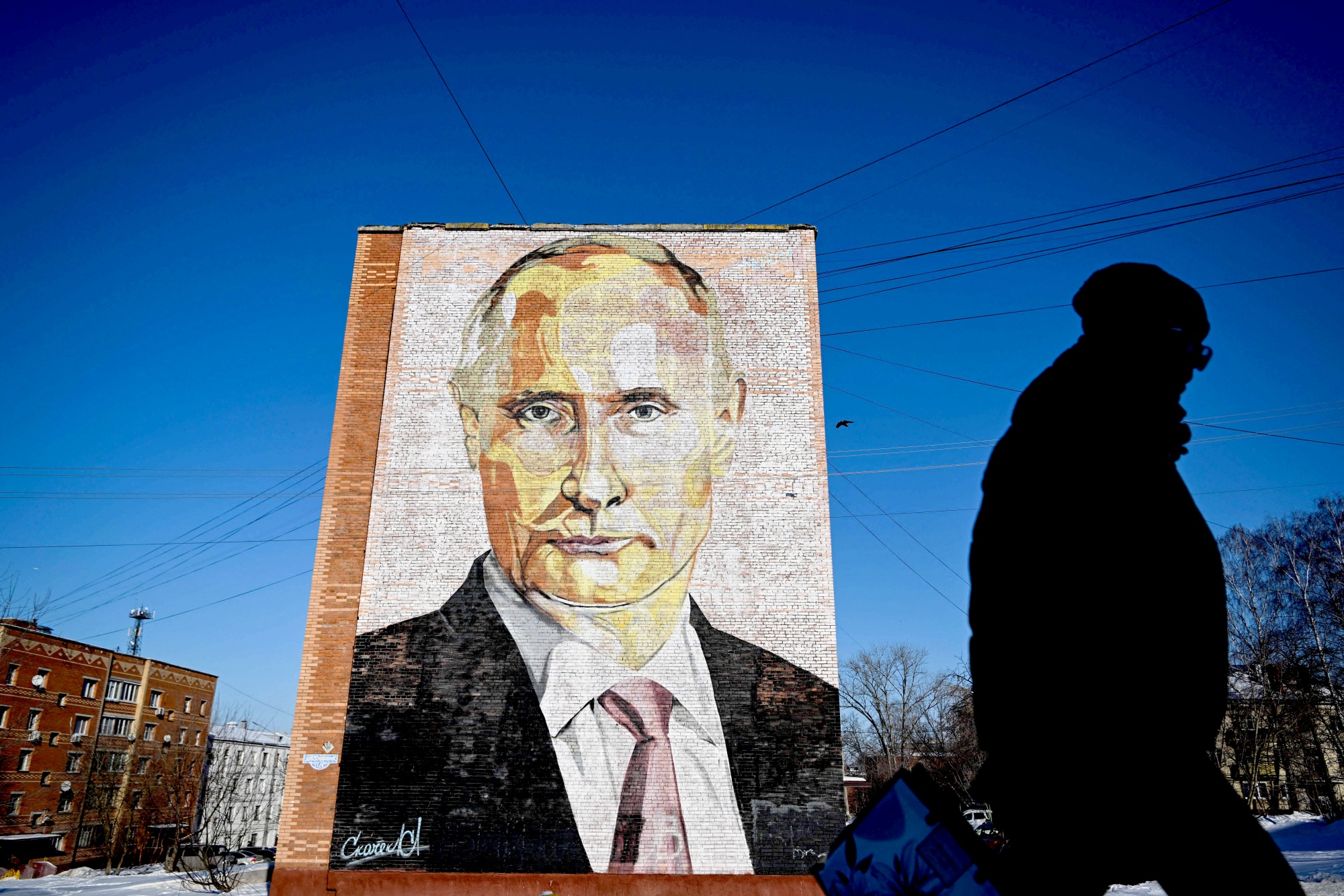 俄罗斯总统弗拉基米尔·普京的壁画出现在莫斯科南部卡希拉的一座住宅楼上,日期为2月23日。摄影师:纳塔利娅·科列斯尼科娃/法新社/盖蒂图片社