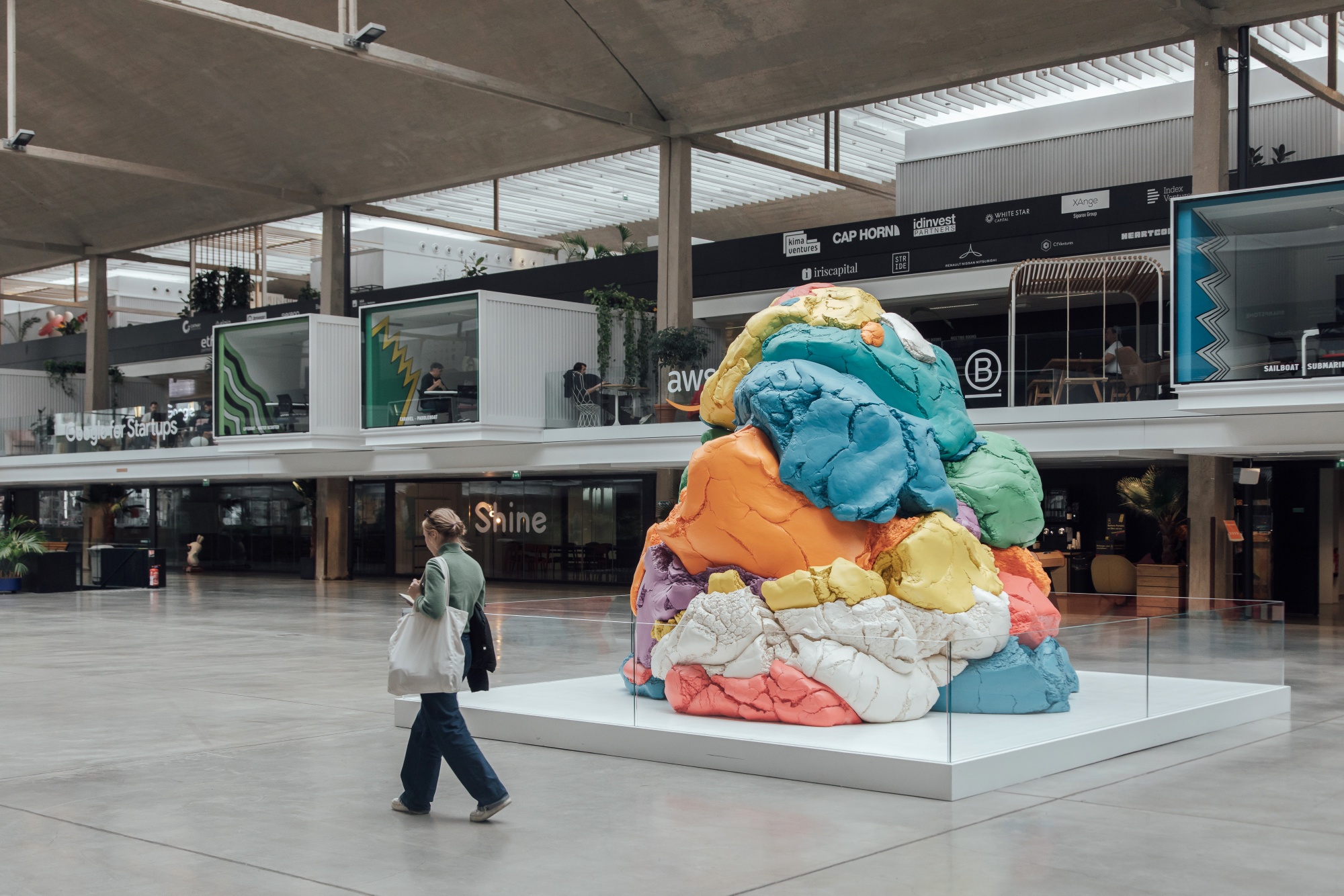杰夫·库恩斯在 Station F 的 Play-Doh 艺术品。摄影师:Cyril Marcilhacy/Bloomberg以 Station F 为例,Giuly 将其描述为硅谷的一个前哨,但“少了一些Patagonia,少了一些鳄梨,也少了一些微笑”,只是半开玩笑。这座原始建于1920年代的铁路仓库与埃菲尔铁塔一样高。法国电信亿万富翁 Xavier Niel 在2017年重新开放了这个场地,设有大量办公桌、玻璃墙和丰富的瑞士蕨植物,将其打造成了一个容纳数千名企业家和编程人员的校园。