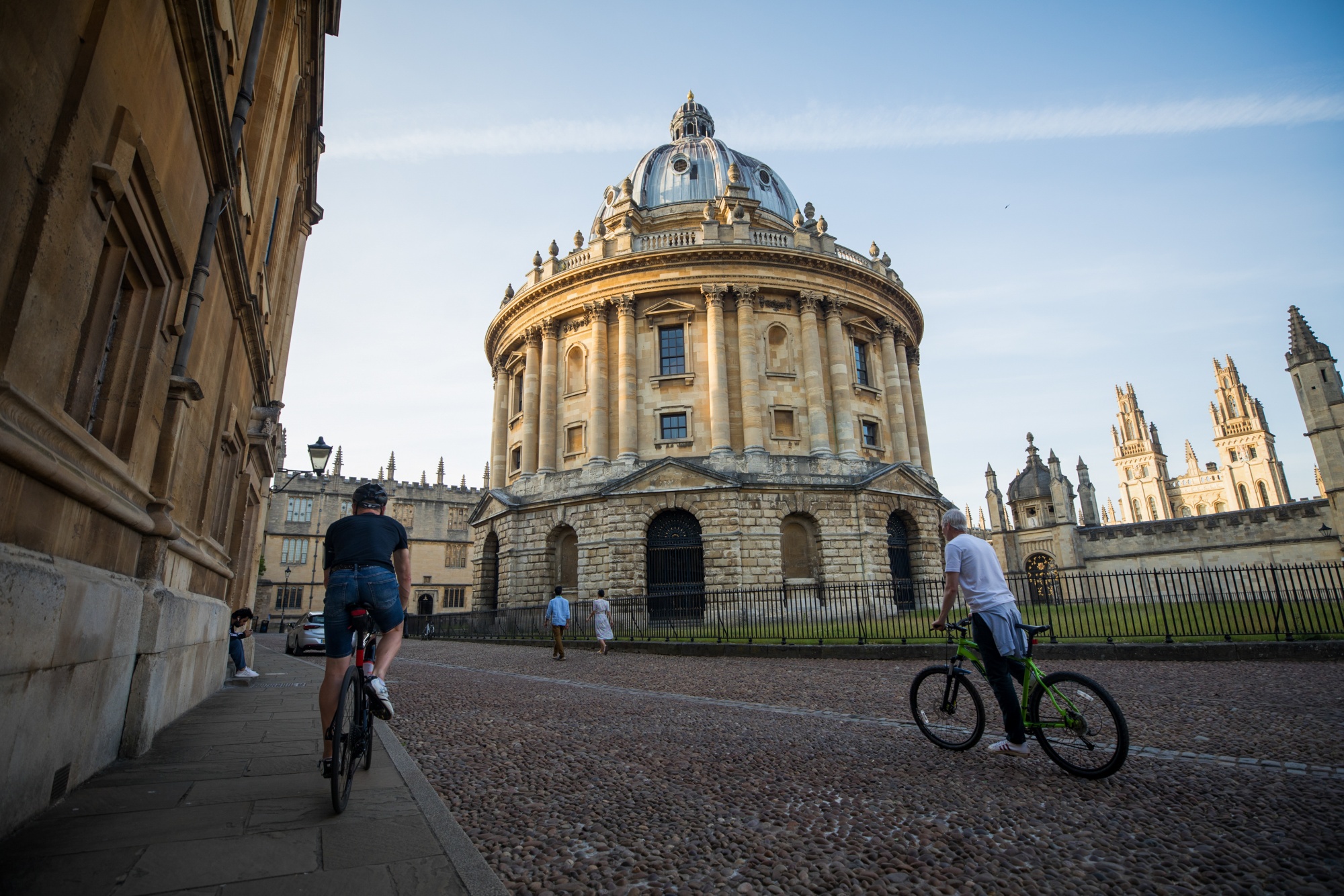 骑自行车的人经过牛津大学的Radcliffe Camera建筑,位于英国牛津。