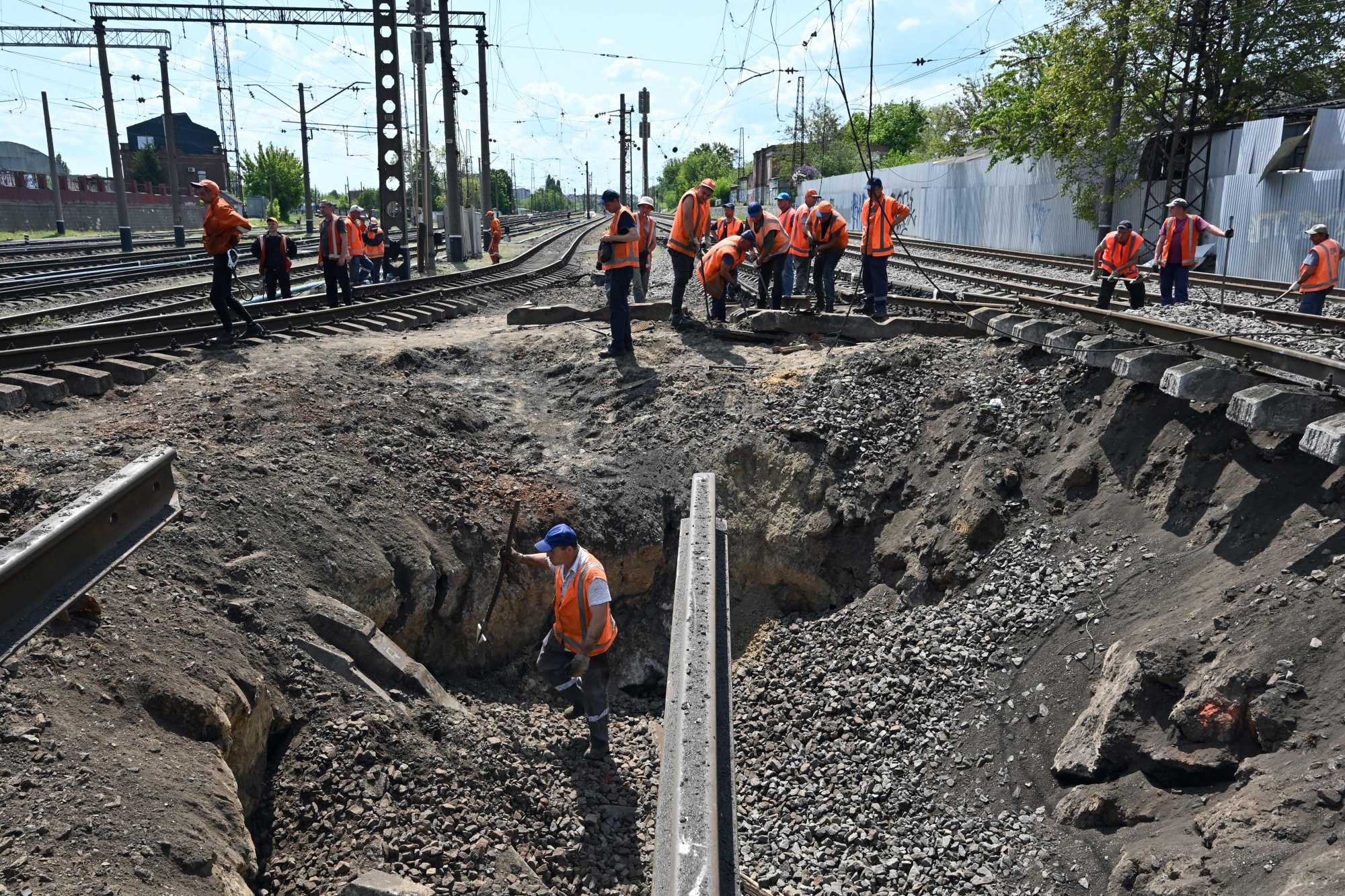 工人们在哈尔科夫修复受到导弹爆炸破坏的铁路轨道,日期为5月14日。
