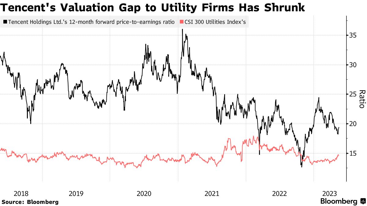 腾讯与中证300公用事业指数之间的估值差距已大大缩小。在2020年底,该公司的股价几乎是该指数的两倍。现在,它的前瞻性盈利约为19倍,而公用事业指数约为15倍。