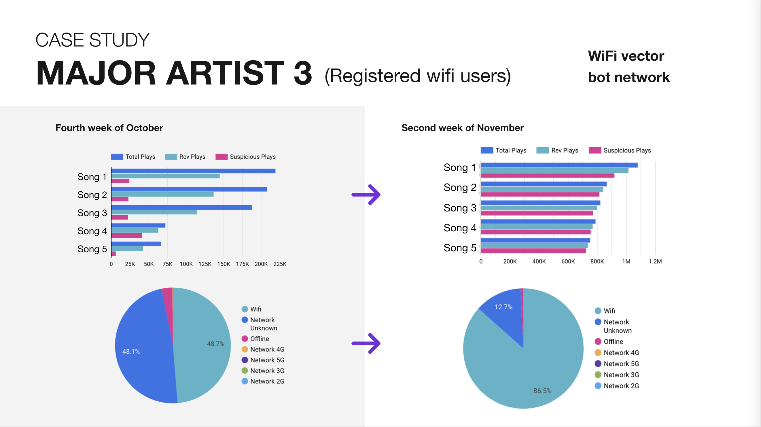 Beatdapp欺诈案例研究来源:Beatdapp他们还举了两个涉及重要艺人的例子。其中一个描述了一种情况,即产生收入的播放次数,或者持续时间足够长以计为付费收听的流量,在艺人的目录中大幅增加。这个机器人网络主要依赖于Wi-Fi,这可以帮助掩盖用户的来源,而不是使用桌面应用程序甚至手机网络。