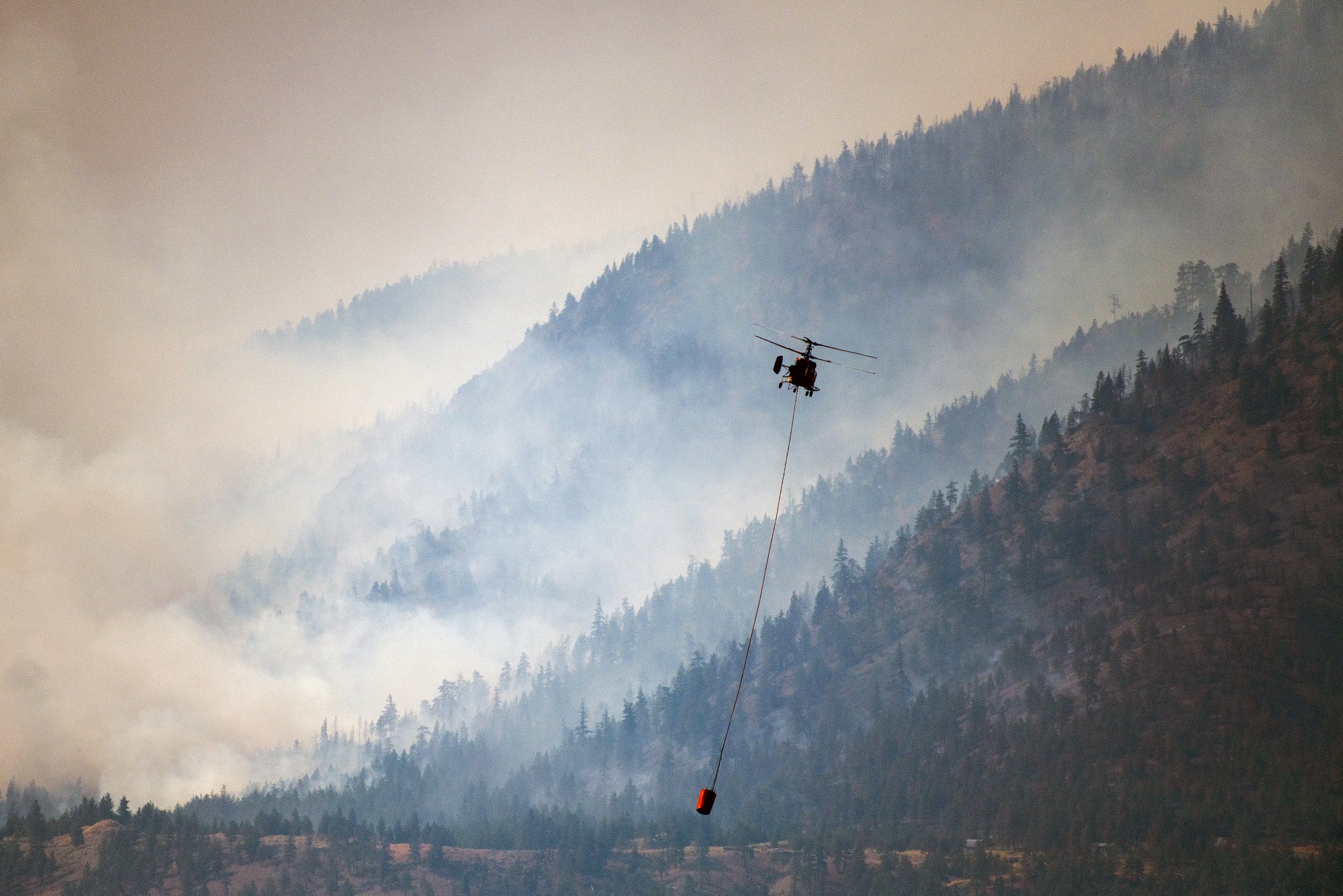 直升机准备在加拿大不列颠哥伦比亚省Lytton附近的弗雷泽河谷进行水上投放,时间是2021年7月2日。