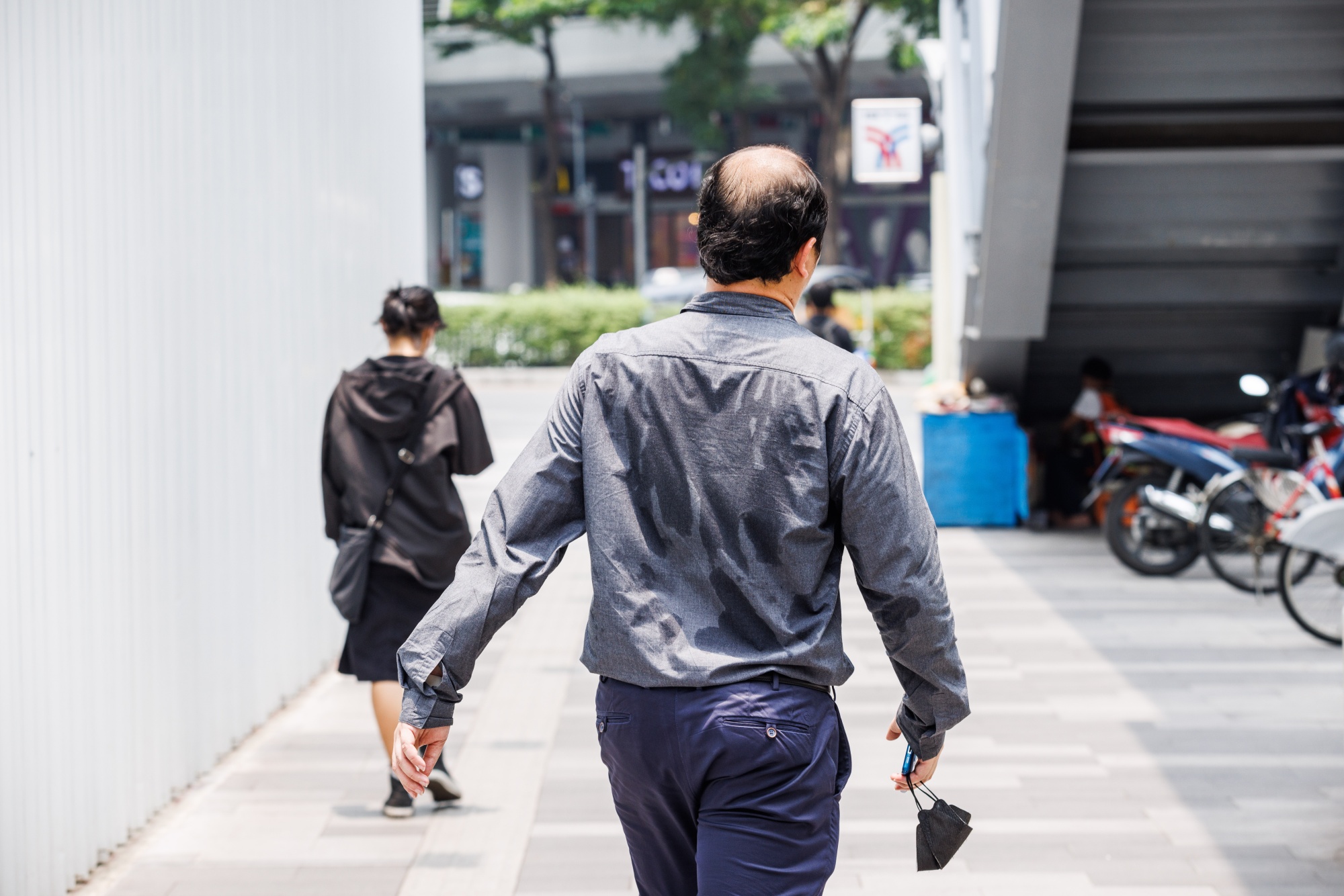 曼谷,泰国,2023年4月27日星期四,一名行人穿着汗湿的衬衫在热浪中。