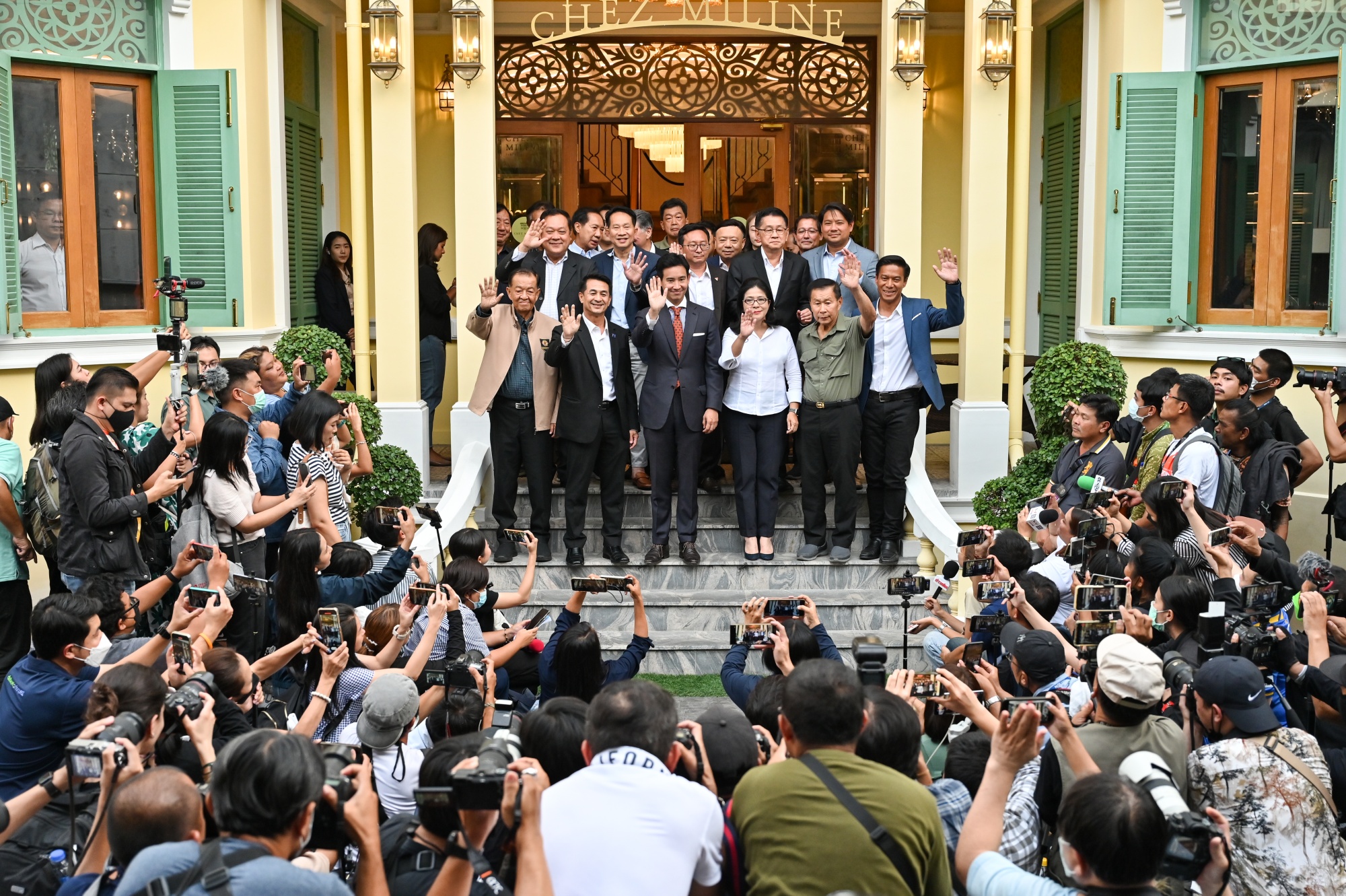 Pita Limjaroenrat,前进党领袖,中间,周三,2023年5月17日,在泰国曼谷与联盟伙伴会面。摄影师:詹姆斯·威尔逊/彭博社泰国选举获胜的前进党拥有TikTok优势:尽管全国各大政党都利用社交媒体传播他们的信息,但前进党做得更有效、更有创意,帮助其吸引年轻选民,并超越预先的民意调查。