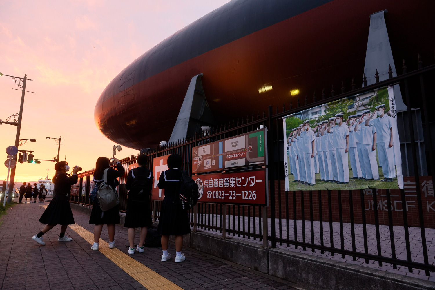 呉市海事博物館外的海報。攝影師:Shiho Fukada,為彭博商業周刊拍攝呉市位於廣島市中心以南約20公里處,以一系列繁忙的碼頭為中心。擁有海軍基地、飛機發動機零件工廠和主要造船廠,呉市在某種程度上是日本極為罕見的軍事城市。在一條路邊,一則招募廣告寫道:“想要更高的教育,就加入自衛隊。想要工作,就加入自衛隊。”