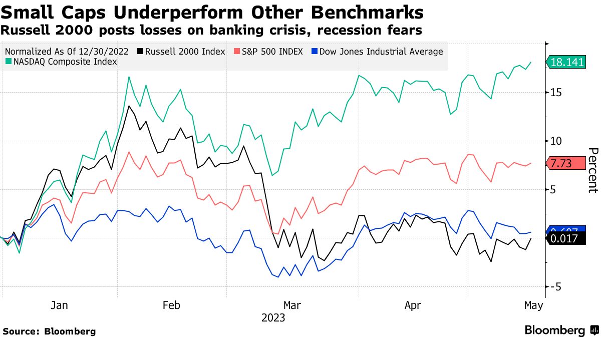 自2022年初开始通胀加剧和美联储开始加息以遏制通胀以来,小市值股票一直是市场中受打击最严重的群体,罗素2000指数的损失比标普500指数、纳斯达克100指数和道琼斯工业平均指数更为严重。而随着科技行业的崛起和小市值股票继续落后,今年这种表现差距变得更加明显。