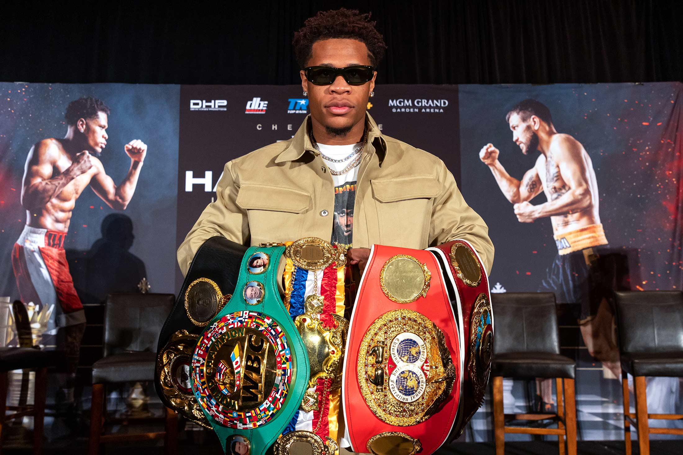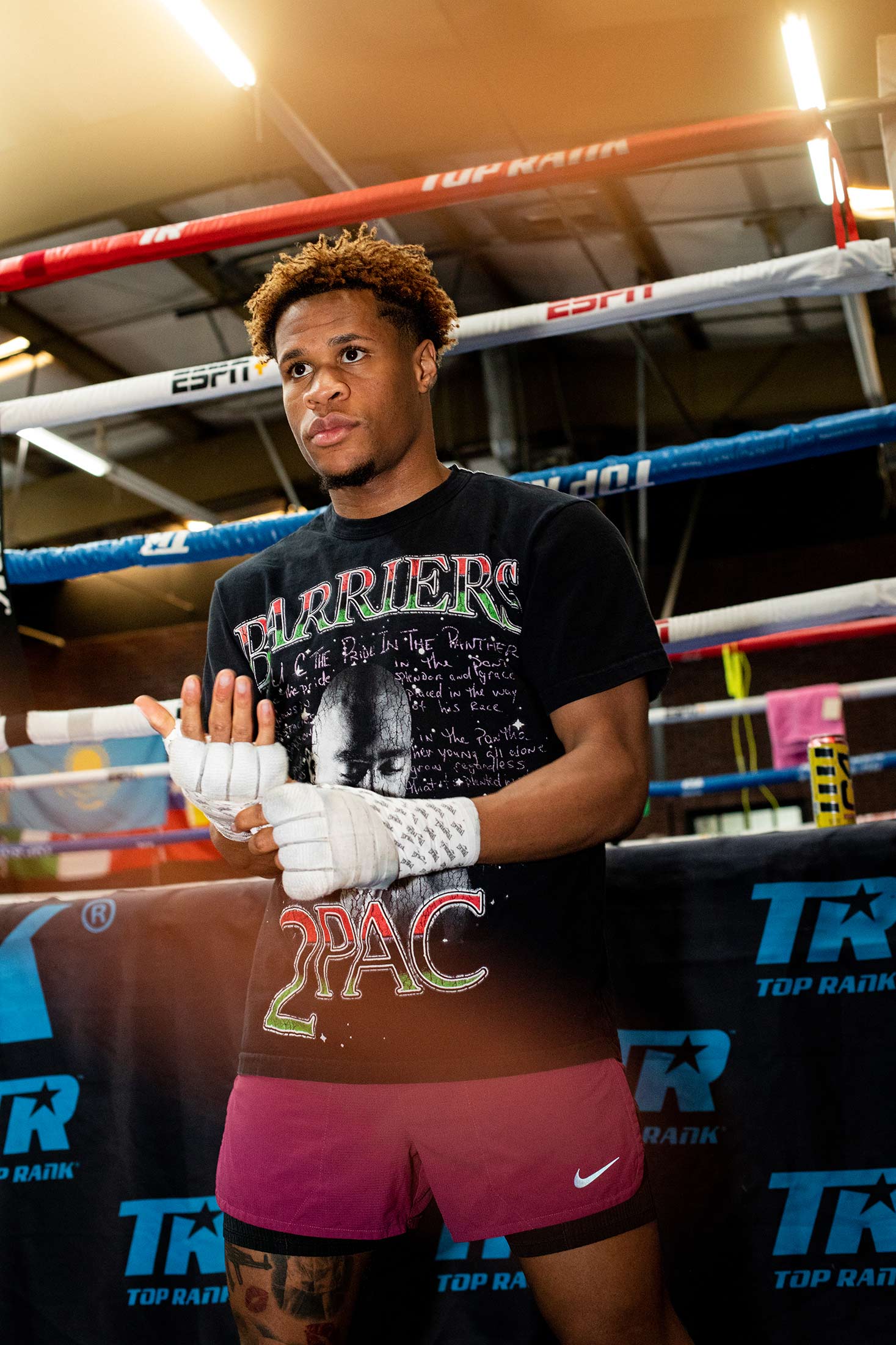 摄影师:Martina Albertazzi,彭博商业周刊“他们如今对我不屑一顾,现在他们将为此付出代价!”标题写道,我们看到世界轻量级拳击冠军左肩到太阳穴上摞着一叠100美元的钞票。他当时身处纽约市的钻石区一家珠宝店,戴着五个手镯、三枚戒指、两只手表和一个镶满钻石的DHP吊坠。“DHP”代表 Devin Haney Promotions;这位拳击手19岁时成为美国历史上最年轻的持牌推广人。现在他24岁,战绩29胜0负,将于5月20日在拉斯维加斯MGM大花园竞技场的16800座位花园竞技场中卫冕自己的头衔,对手是瓦西里·洛马琴科。这位被称为“梦想”的小子将赚取400万美元加上分成的付费电视收入。