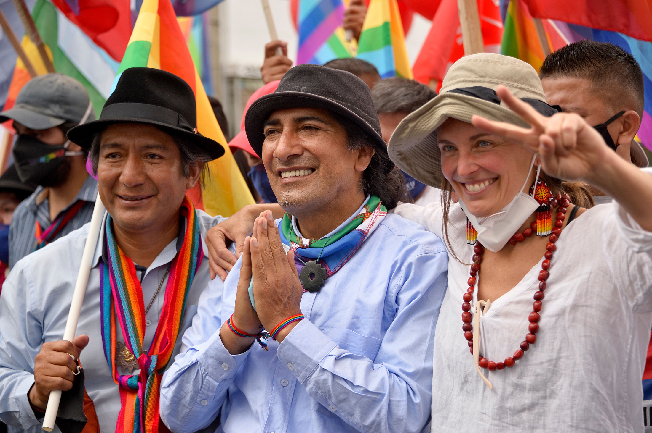 雅库·佩雷斯,中间,他的伴侣曼努埃拉·皮克,右边,以及印第安领袖萨尔瓦多·奎斯佩,在2021年总统竞选期间。来源:罗德里戈·布恩迪亚/法新社/彭博社