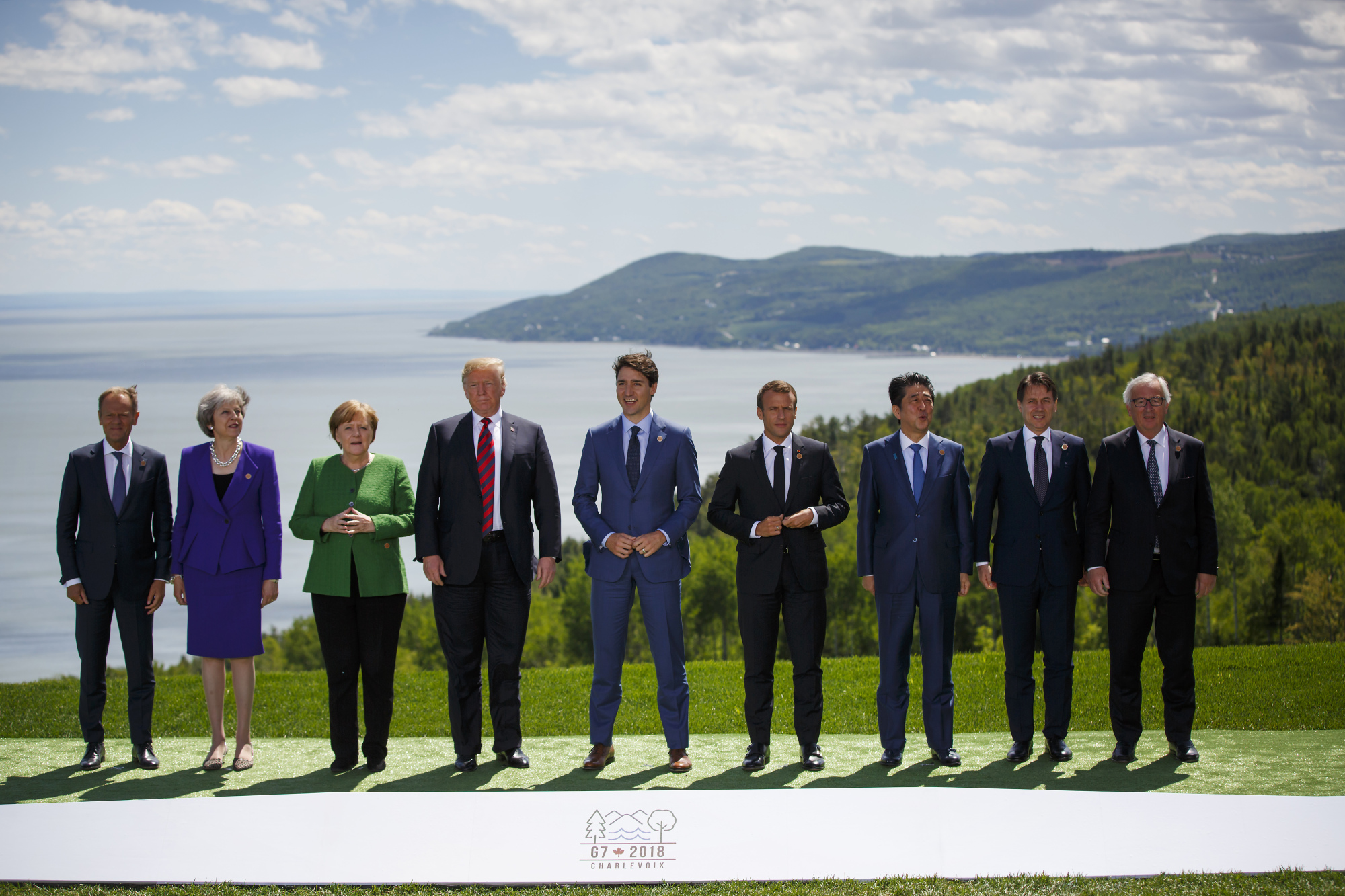 当时的欧洲理事会主席唐纳德·图斯克、当时的英国首相特蕾莎·梅、默克尔、当时的美国总统唐纳德·特朗普、特鲁多、马克龙、当时的日本首相安倍晋三、当时的意大利总理朱塞佩·孔特和当时的欧洲委员会主席让-克洛德·容克在2018年6月加拿大G-7峰会的全家福照片中。摄影师:Cole Burston/Bloomberg与康沃尔的阳光相比,2018年在加拿大举行的峰会是一个充满紧张气氛的会议,即使领导人们试图在全家福照片中展示合作。